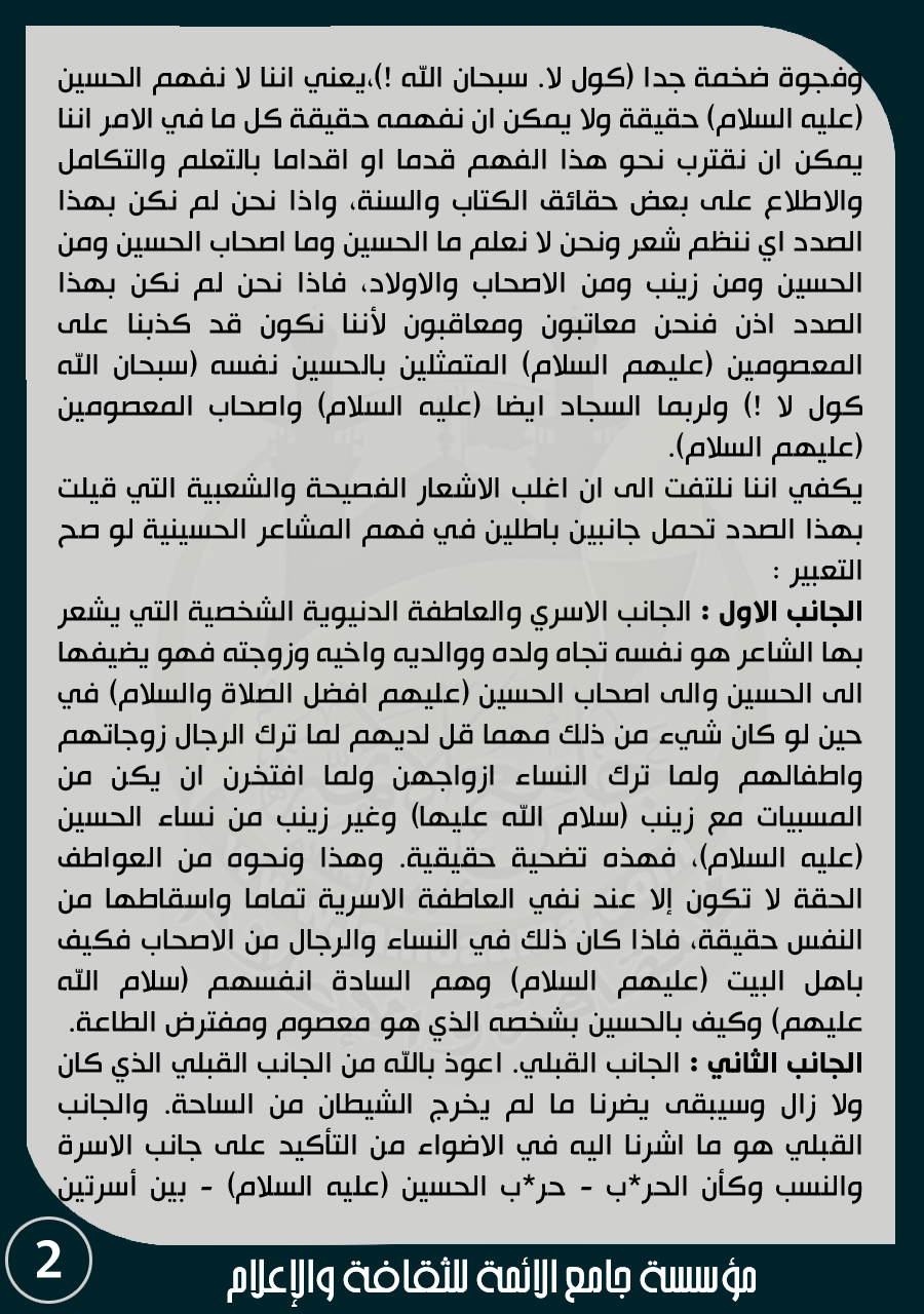 السيد الشهيد محمد الصدر (قدس) وتصحيح أفكار الشعراء حول الإمام الحسين عليه السلام لا شك ان العنصر الرئيسي في ارتفاع اهمية نظم الشعر العربي في الاسلام عامة وفي المذهب خاصة وتعمقه وكثرته انما سببه ثورة الحسين (عليه افضل الصلاة والسلام) وحركته المقدسة التي اوجبت واوجدت كما يقول الخبر : (حرارة في قلوب شيعته لن تخمد الى يوم القيامة). الامر الذي انتج ان تقول مئات الشعراء بل آلاف الشعراء في هذه المناسبة الشجية انواعا من الشعر بما فيها الشعر القريض والشعر الشعبي. وهو الامر الذي سبب ايضا ان يختص الشعراء الموالين جزاهم الله خيرا في كل الاجيال بأفضل القصائد العربية واكثرها رصانة وجمالا مما هو غير موجود في سائر مذاهب الاسلام فضلا عن غير المسلمين وهو (وهذه العبارة ايضا مشهورة والتفكير فيها راجح جدا) وهو الذي عبر عنه الدكتور طه حسين الذي هو اشهر الادباء في مصر والى الان حين قال : لا زال الشعر رافضياً وهي كلمة مشهورة ومشكورة منه توفي رحمه الله قبل عشرين سنة لكن ذكره لا زال موجودا اكيدا وسيبقى. وقوله (لا زال) يعني كان ولا زال وسيبقى على نفس الحال. وبالرغم من نقطة القوة هذه التي لا تعدلها نقطة واهمية عالية جدا وشكرا لله على حسن فضله، فأننا نعلم ان كل شاعر سواءً كان فصيحا ام شعبيا ينظم الشعر في الحسين (عليه السلام) واصحابه بمقدار ما يفهم من ثورة الحسين ومن اقواله ومن افعاله. ولا نتوقع من الشاعر ان يتعدى فهمه الشخصي بطبيعة الحال بل لعل ذلك يكون في عداد المستحيل في حين اننا نعلم بكل تأكيد ان بين فهمنا للحسين (عليه السلام) هو واقع الحسين (عليه السلام) وحقيقة مقاصده بونا شاسعا وفجوة ضخمة جدا (كول لا. سبحان الله !) يعني اننا لا نفهم الحسين (عليه السلام) حقيقة ولا يمكن ان نفهمه حقيقة كل ما في الامر اننا يمكن ان نقترب نحو هذا الفهم قدما او اقداما بالتعلم والتكامل والاطلاع على بعض حقائق الكتاب والسنة، واذا نحن لم نكن بهذا الصدد اي ننظم شعر ونحن لا نعلم ما الحسين وما اصحاب الحسين ومن الحسين ومن زينب ومن الاصحاب والاولاد، فاذا نحن لم نكن بهذا الصدد اذن فنحن معاتبون ومعاقبون لأننا نكون قد كذبنا على المعصومين (عليهم السلام) المتمثلين بالحسين نفسه (سبحان الله، كول لا !) ولربما السجاد ايضا (عليه السلام) واصحاب المعصومين (عليهم السلام). يكفي اننا نلتفت الى ان اغلب الاشعار الفصيحة والشعبية التي قيلت بهذا الصدد تحمل جانبين باطلين في فهم المشاعر الحسينية لو صح التعبير : الجانب الاول : الجانب الاسري والعاطفة الدنيوية الشخصية التي يشعر بها الشاعر هو نفسه تجاه ولده ووالديه واخيه وزوجته فهو يضيفها الى الحسين والى اصحاب الحسين (عليهم افضل الصلاة والسلام) في حين لو كان شيء من ذلك مهما قل لديهم لما ترك الرجال زوجاتهم واطفالهم ولما ترك النساء ازواجهن ولما افتخرن ان يكن من المسبيبات مع زينب (سلام الله عليها) وغير زينب من نساء الحسين (عليه السلام) فهذه تضحية حقيقية. وهذا ونحوه من العواطف الحقة لا تكون إلا عند نفي العاطفة الاسرية تماما واسقاطها من النفس حقيقة، فاذا كان ذلك في النساء والرجال من الاصحاب فكيف باهل البيت (عليهم السلام) وهم السادة انفسهم (سلام الله عليهم) وكيف بالحسين بشخصه الذي هو معصوم ومفترض الطاعة. الجانب الثاني : الجانب القبلي. اعوذ بالله من الجانب القبلي الذي كان ولا زال وسيبقى يضرنا ما لم يخرج الشيـ،*ـطان من الساحة. والجانب القبلي هو ما اشرنا اليه في الاضواء من التأكيد على جانب الاسرة والنسب وكأن الحـ،*ـرب (حـ،*ـرب الحسن (عليه السلام)) بين اسرتين متعـ،*ـاديتين لا بين الحق والباطل وذلك في مثل قول الشاعر : قوِّضي يا خيامَ عليا نزارٍ فلقد قوَّض العمادُ الرفيعُ واملئي العينَ يا أُميَّة نوماً فحسينٌ على الصعيدِ صريعُ وكأن بني امية انتصروا على الحسين فقط. وغير ذلك كثير في حين اننا نعلم ان هذا من غير المحتمل ان يخطر في بال الحسين (عليه السلام) واصحابه طرفة عين فضلا عن ان يكون هو الهدف الرئيسي لهم ولو كان هو الهدف 