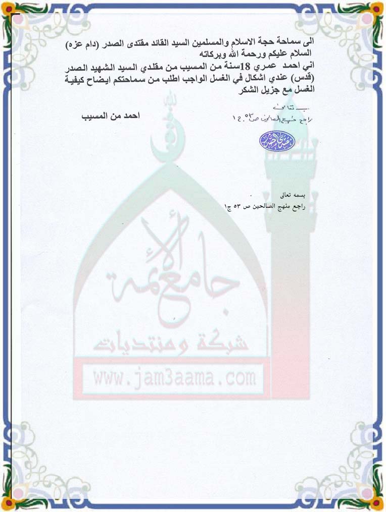 استفتاء للسيد القائد مقتدى الصدر حول كيفية الغسل الواجب بتاريخ 23-11