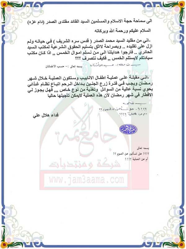 استفتاء للسيد القائد مقتدى الصدر حول تسليم الحقوق الشرعية - الافطار في شهر رمضان بتاريخ 23-11