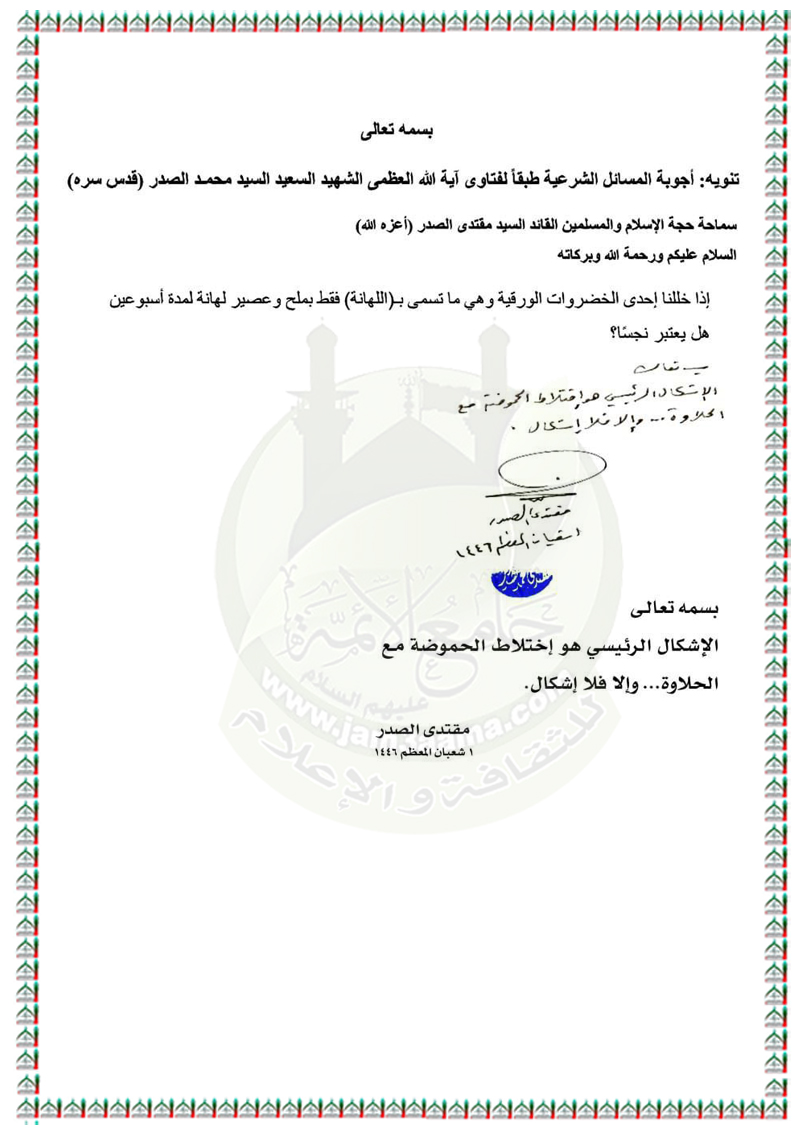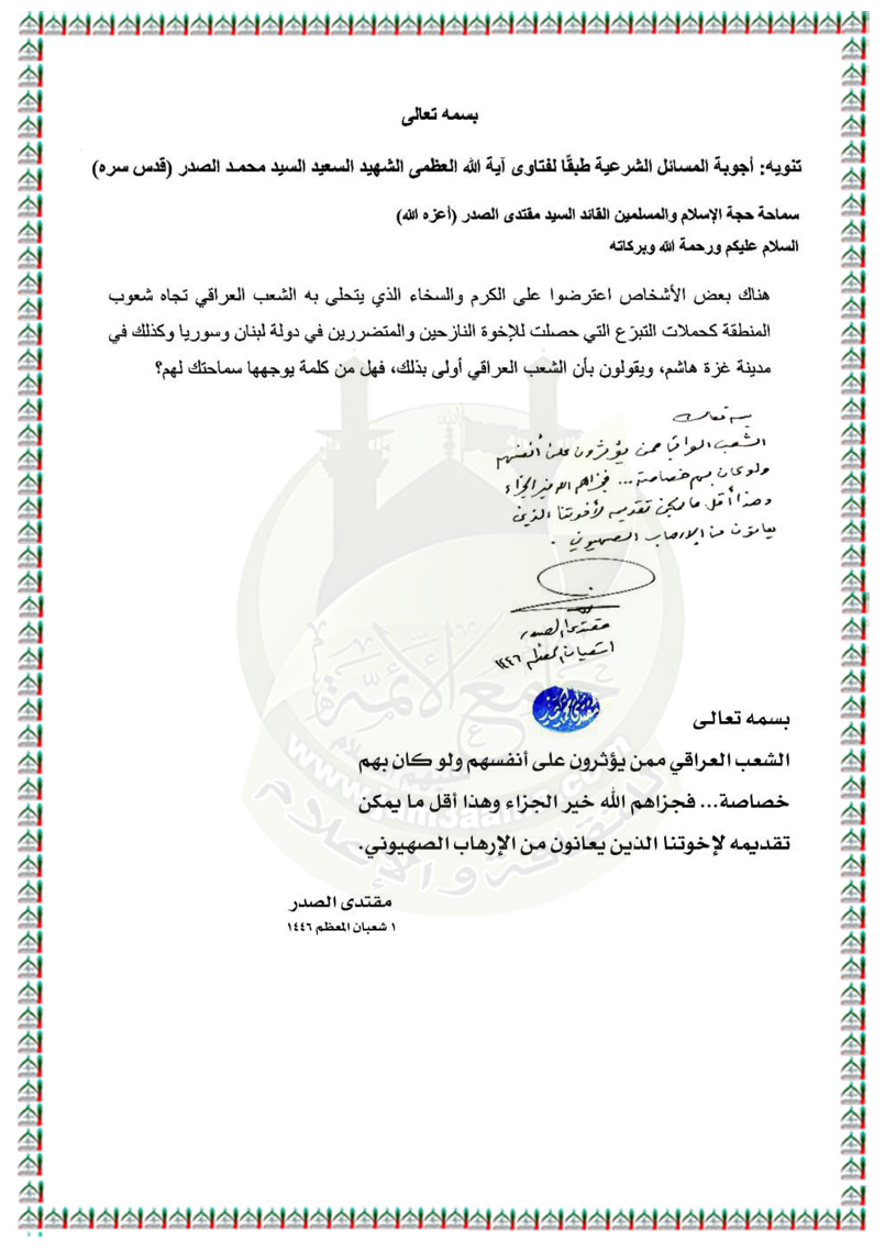 الأسئلة المُجابة من قِبل سماحة السيد مقتدى الصدر (أعزه الله) .. اليوم السادس من شهر شعبان المعظم ١٤٤٦هـ الموافق ٥ / ٢ / ٢٠٢٥