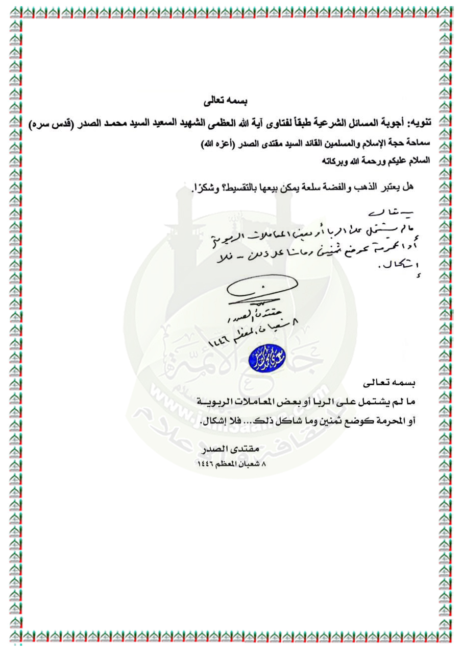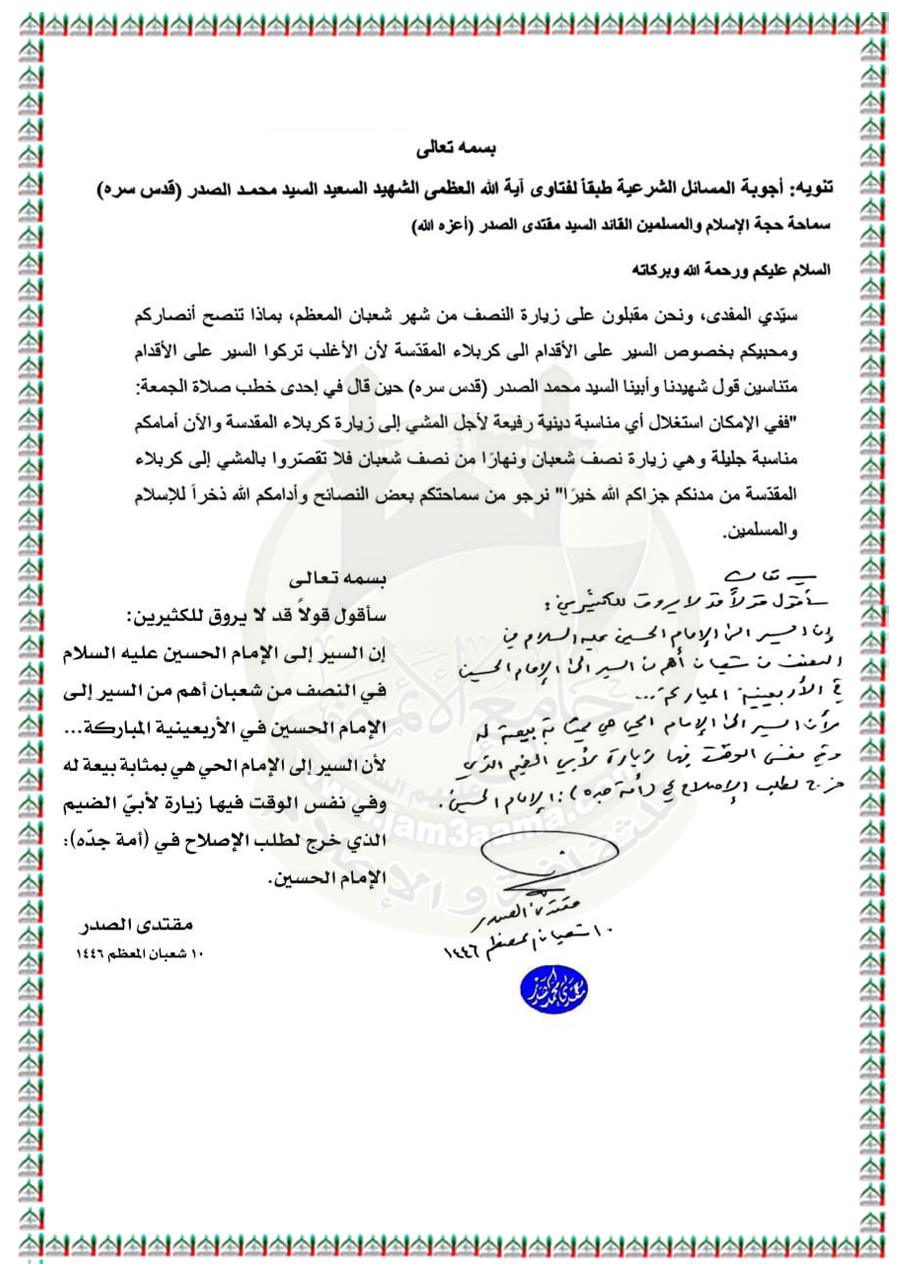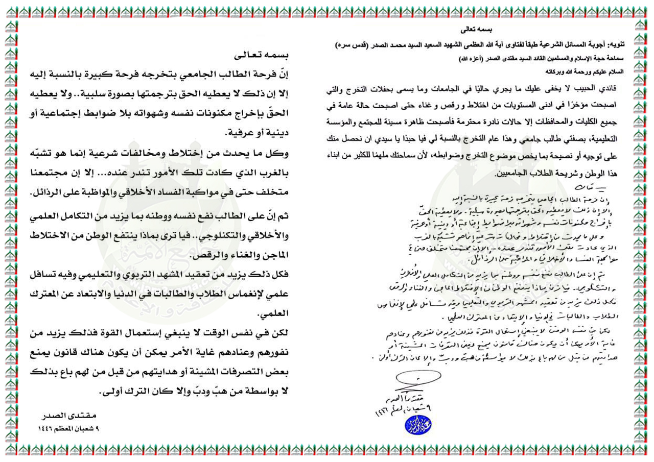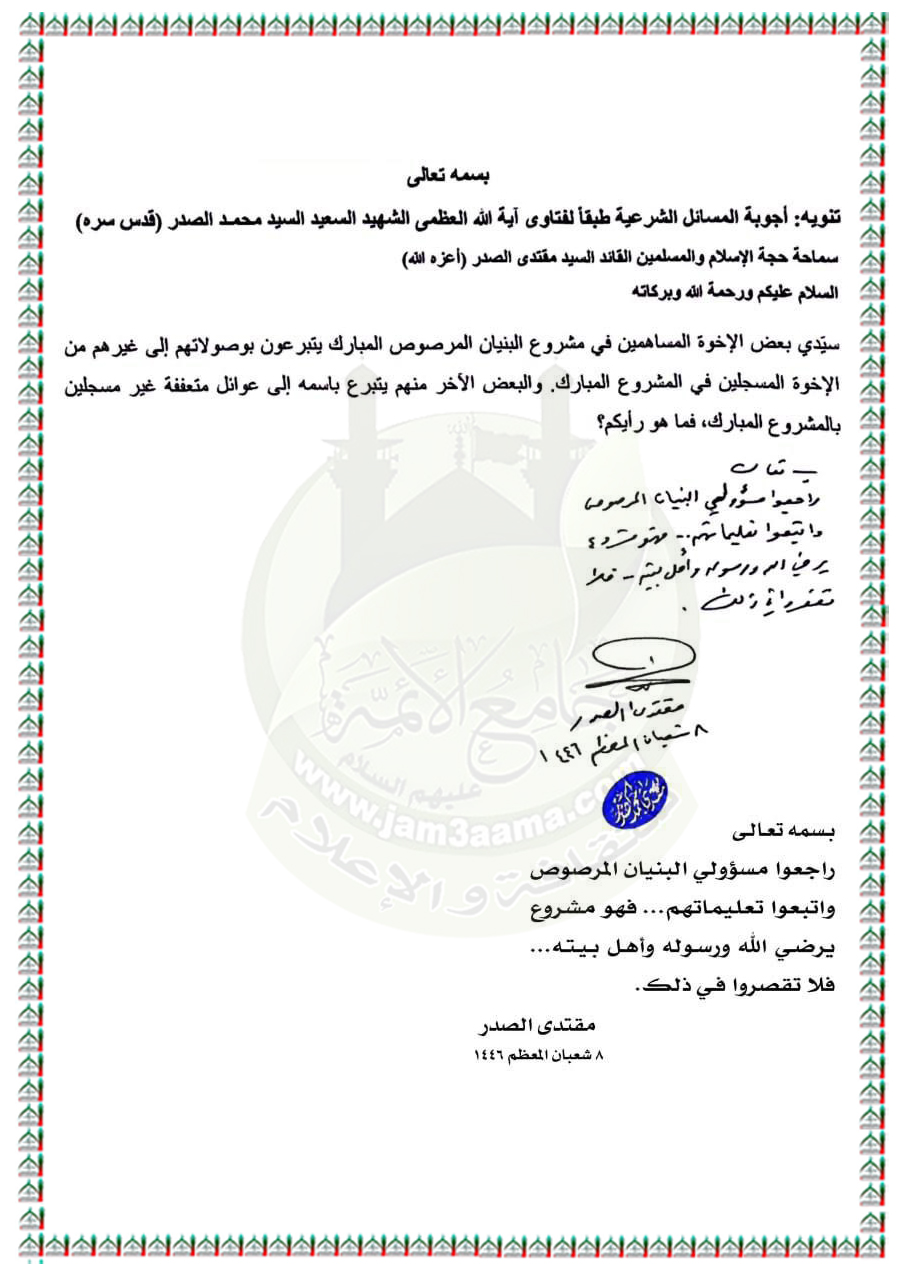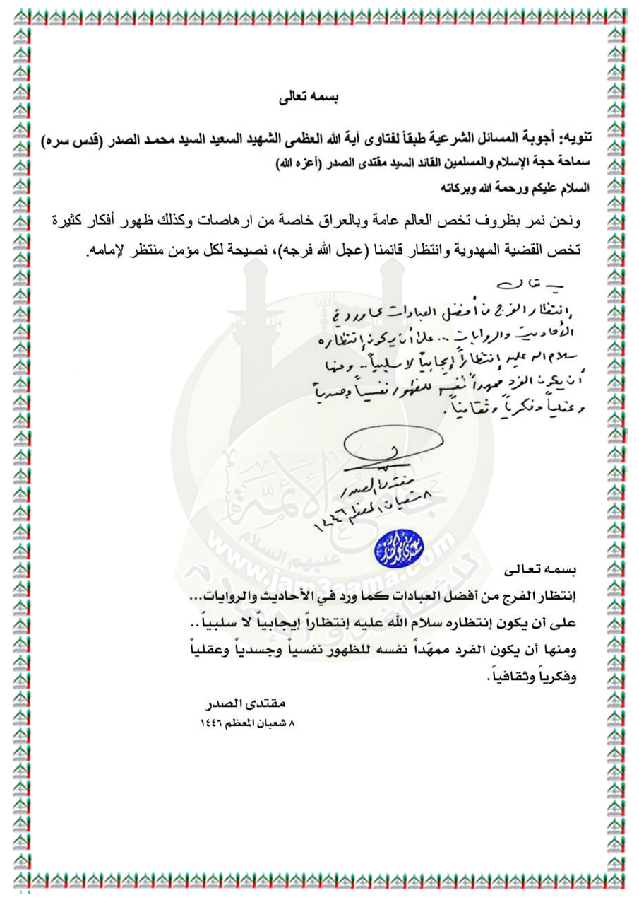 الأسئلة المُجابة من قِبل سماحة السيد مقتدى الصدر (أعزه الله).. اليوم الاثنين الـ ١١ من شهر شعبان المعظم ١٤٤٦هـ الموافق ١٠ / ٢ / ٢٠٢٥