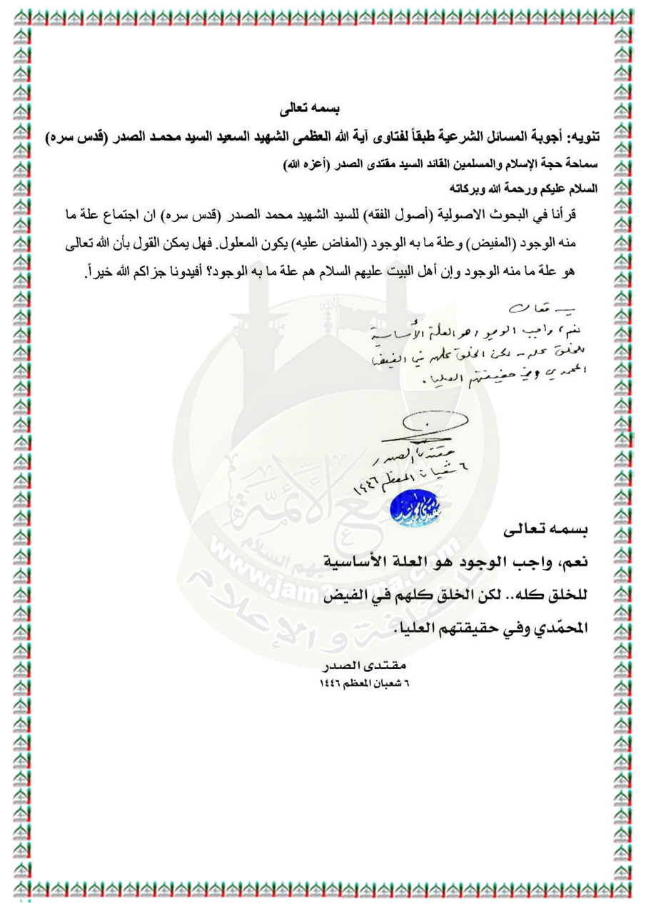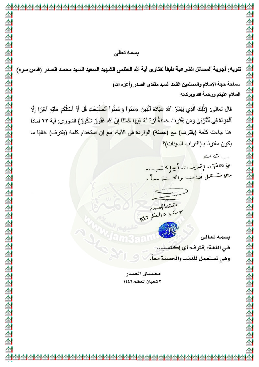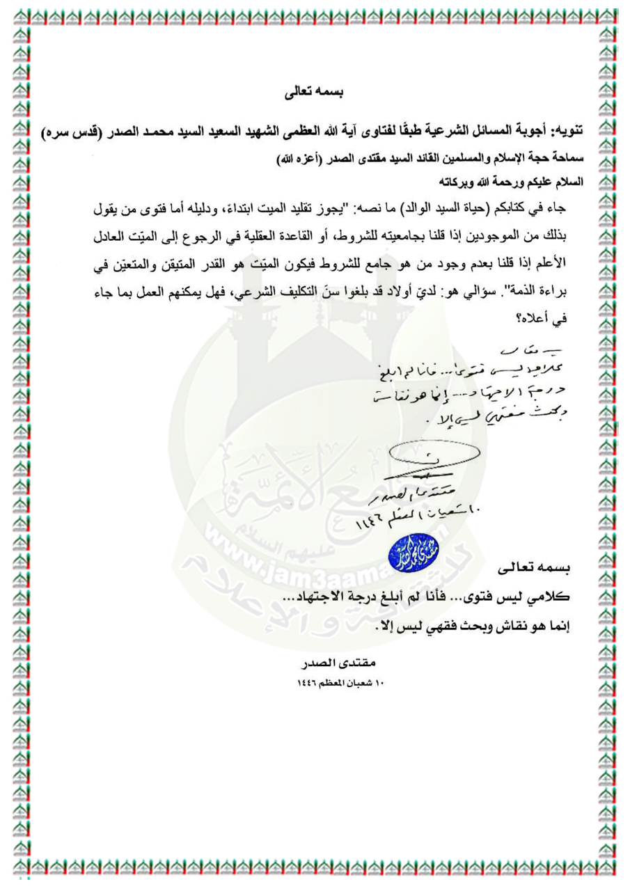 الأسئلة المُجابة من قِبل سماحة السيد مقتدى الصدر (أعزه الله).. اليوم الاربعاء الـ ١٣ من شهر شعبان المعظم ١٤٤٦هـ الموافق ١٢ / ٢ / ٢٠٢٥