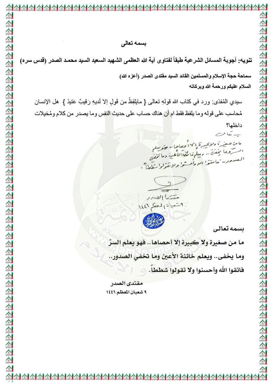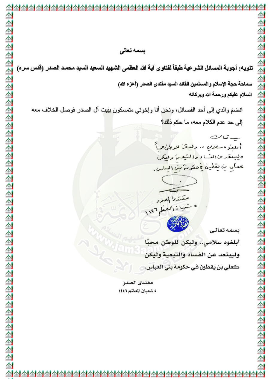 الأسئلة المُجابة من قِبل سماحة السيد مقتدى الصدر (أعزه الله).. اليوم الاثنين الـ ١٨ من شهر شعبان المعظم ١٤٤٦هـ الموافق ١٧ / ٢ / ٢٠٢٥