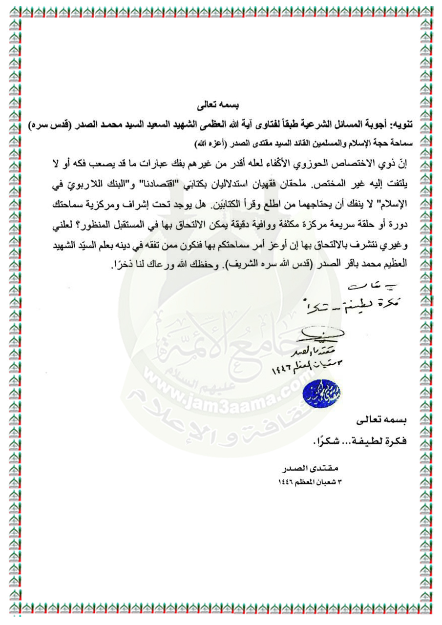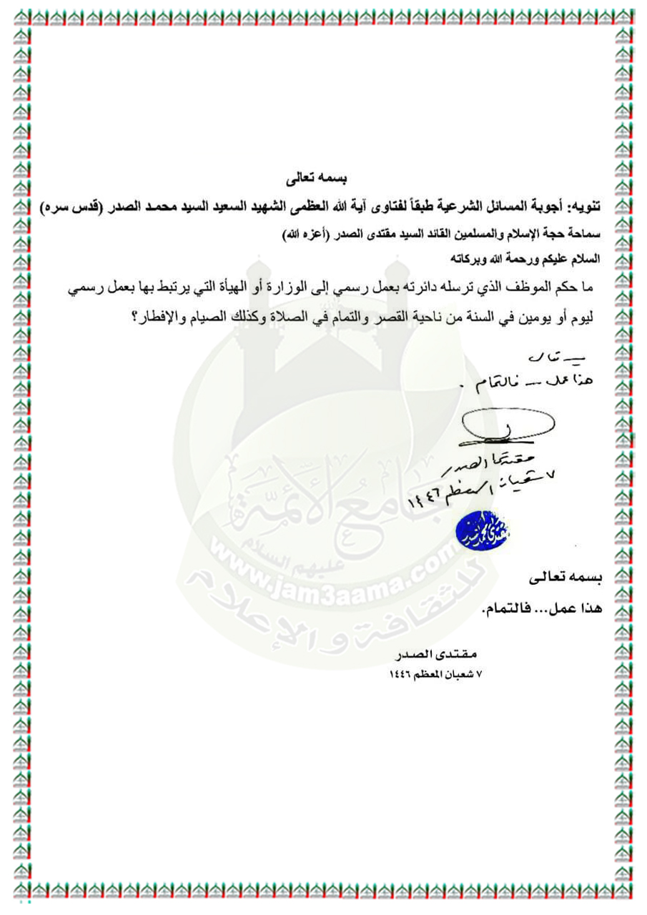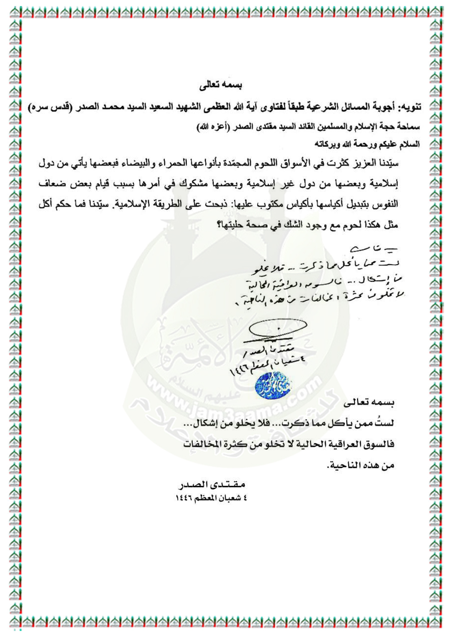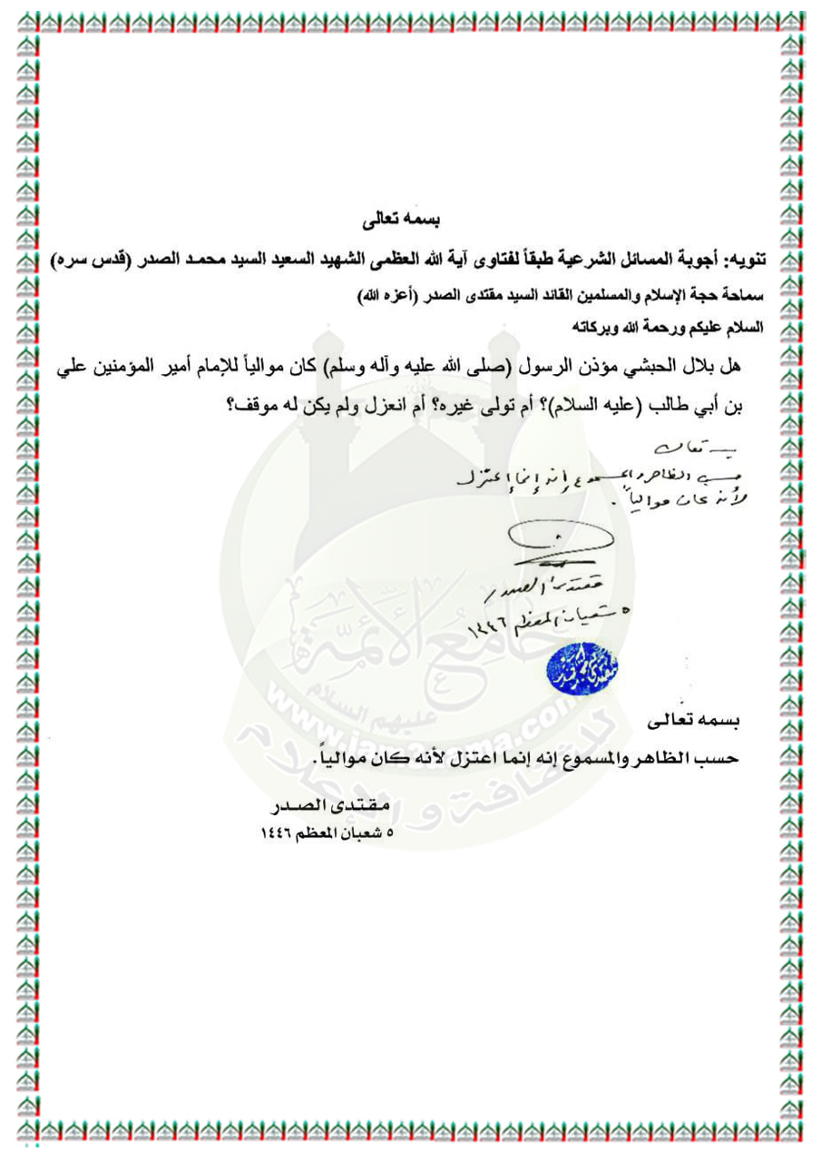 الأسئلة المُجابة من قِبل سماحة السيد مقتدى الصدر (أعزه الله).. اليوم السبت الـ ٢٣ من شهر شعبان المعظم ١٤٤٦هـ الموافق ٢٢ / ٢ / ٢٠٢٥