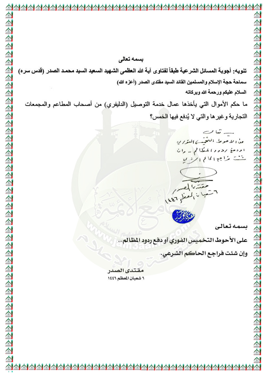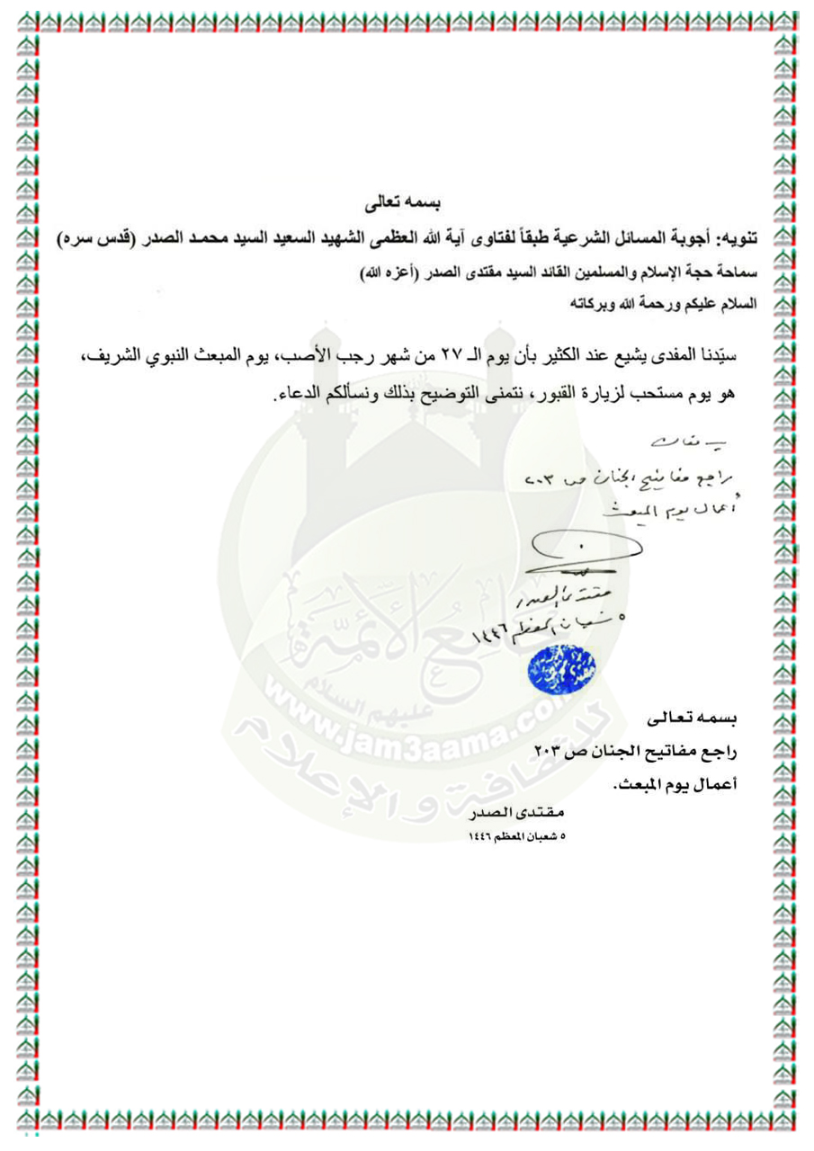 الأسئلة المُجابة من قِبل سماحة السيد مقتدى الصدر (أعزه الله).. اليوم الخميس الـ ٢٨ من شهر شعبان المعظم ١٤٤٦ هـ الموافق ٢٧ / ٢ / ٢٠٢٥