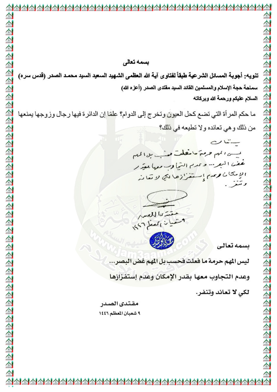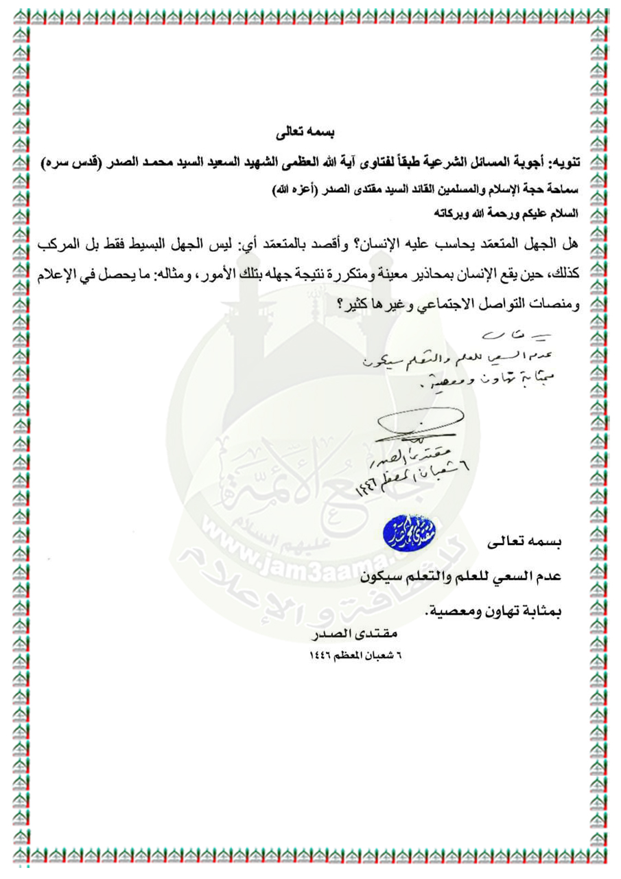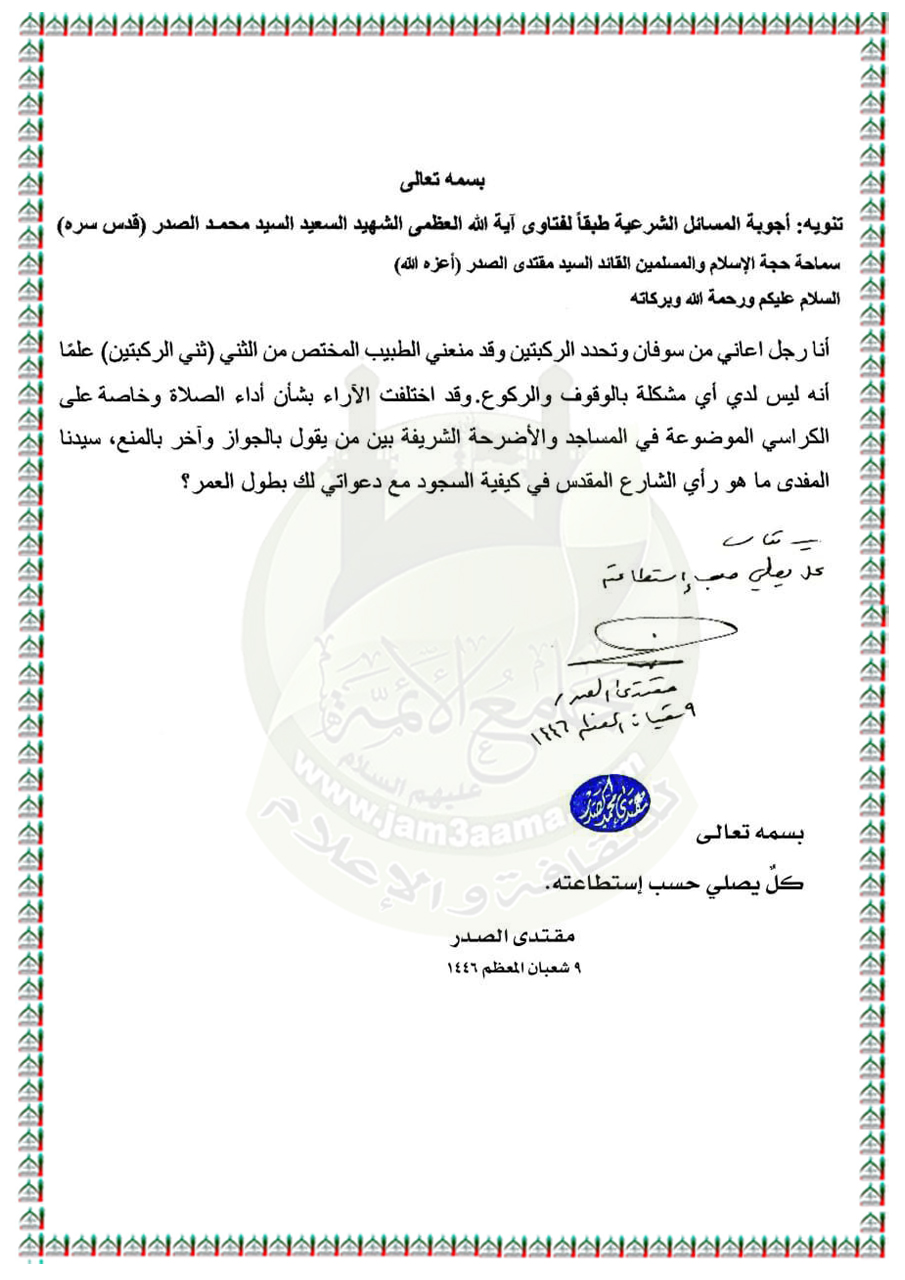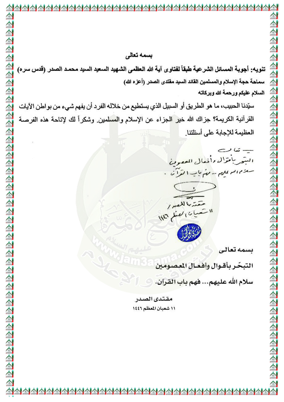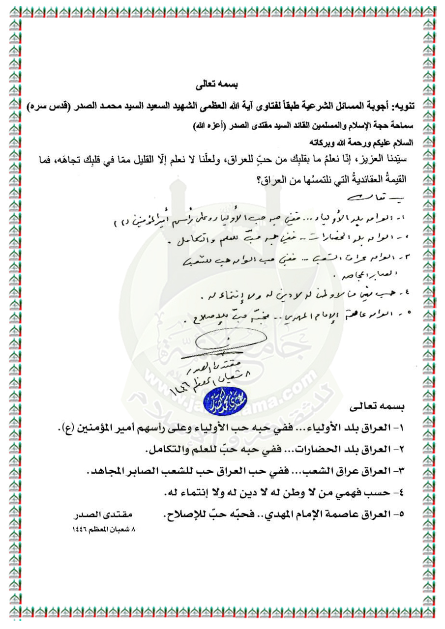 الأسئلة المُجابة من قِبل سماحة السيد مقتدى الصدر (أعزه الله).. اليوم الجمعة ٧ / ٣ / ٢٠٢٥