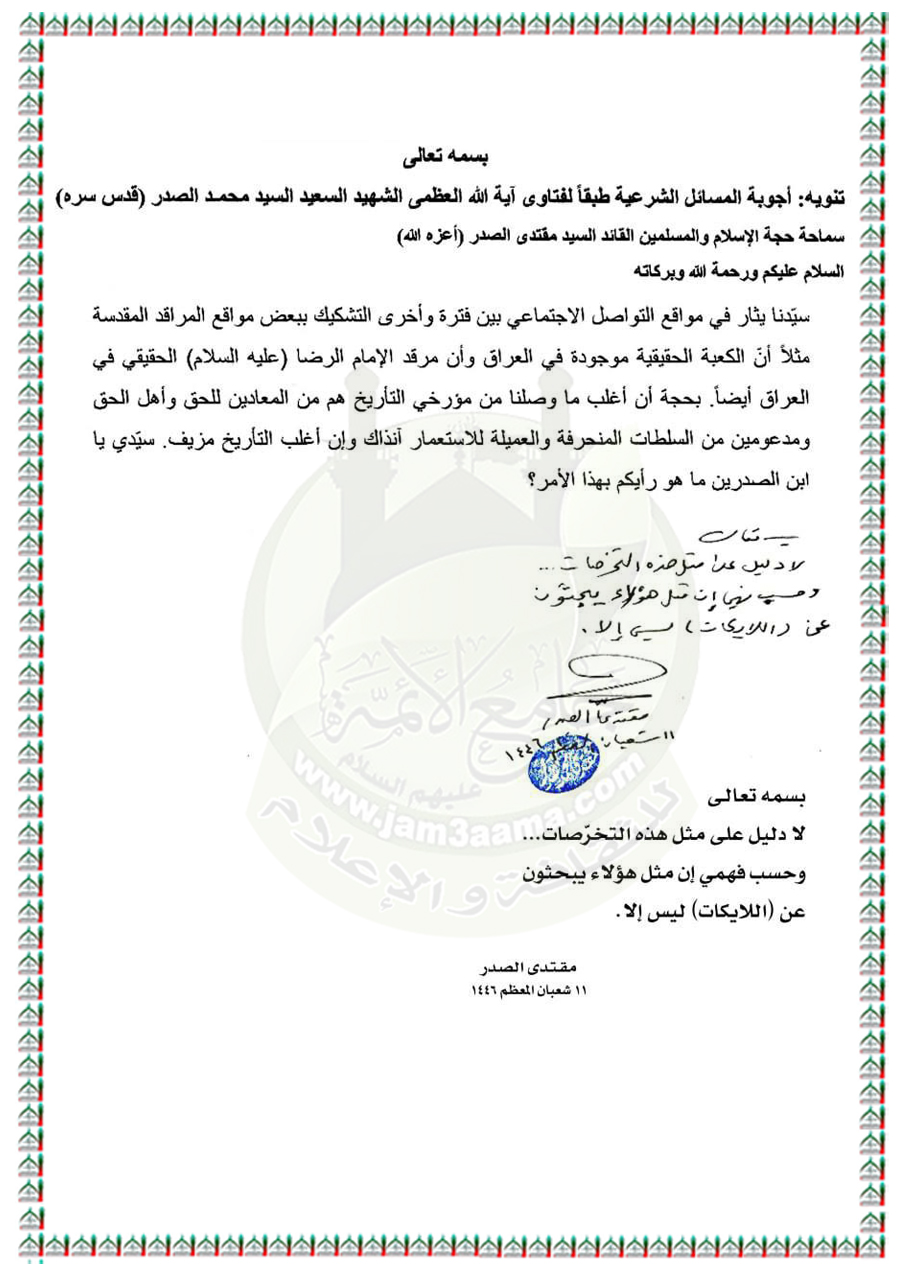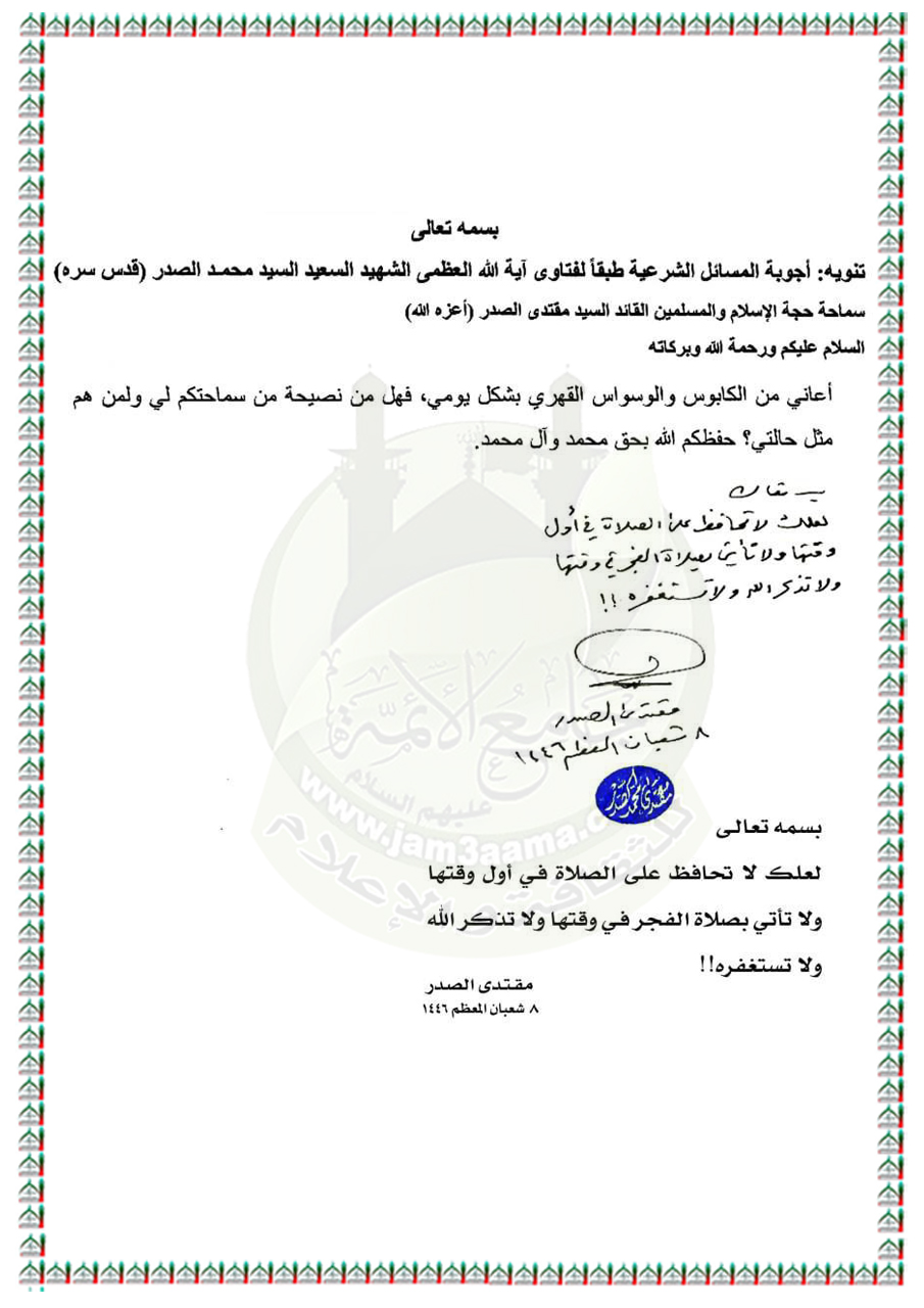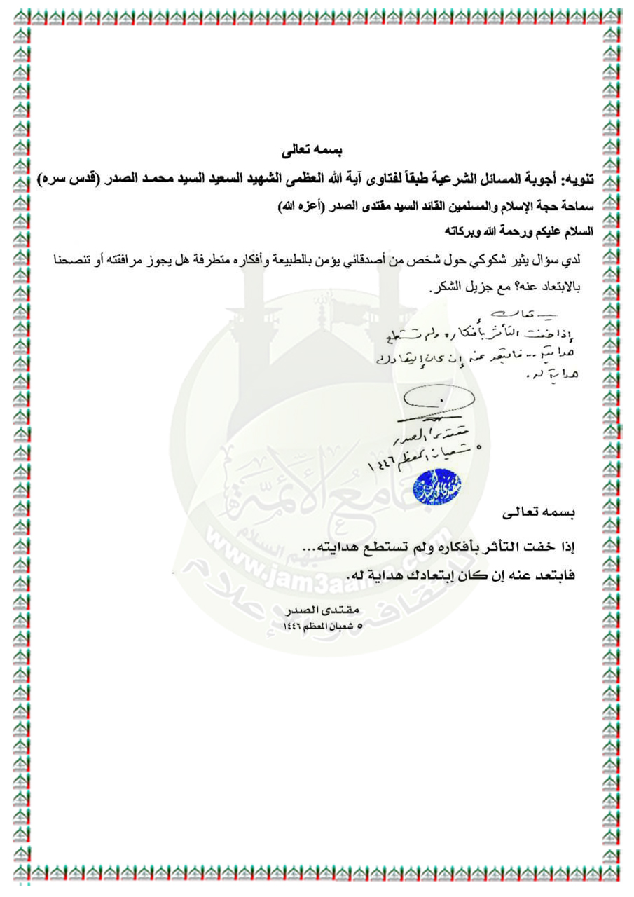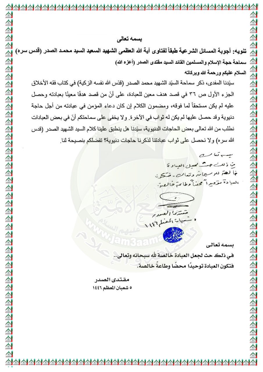 الأسئلة المُجابة من قِبل سماحة السيد مقتدى الصدر (أعزه الله).. اليوم الاثنين ١٠ / ٣ / ٢٠٢٥