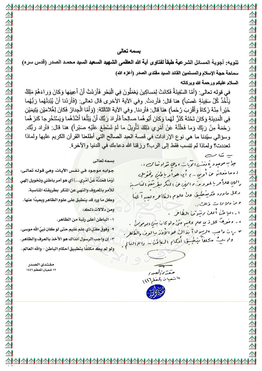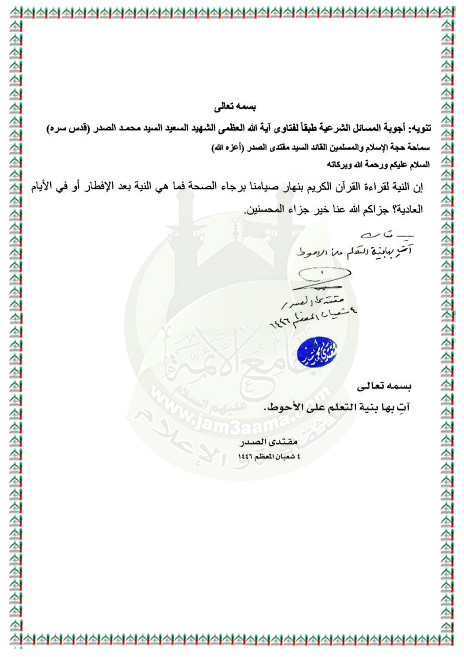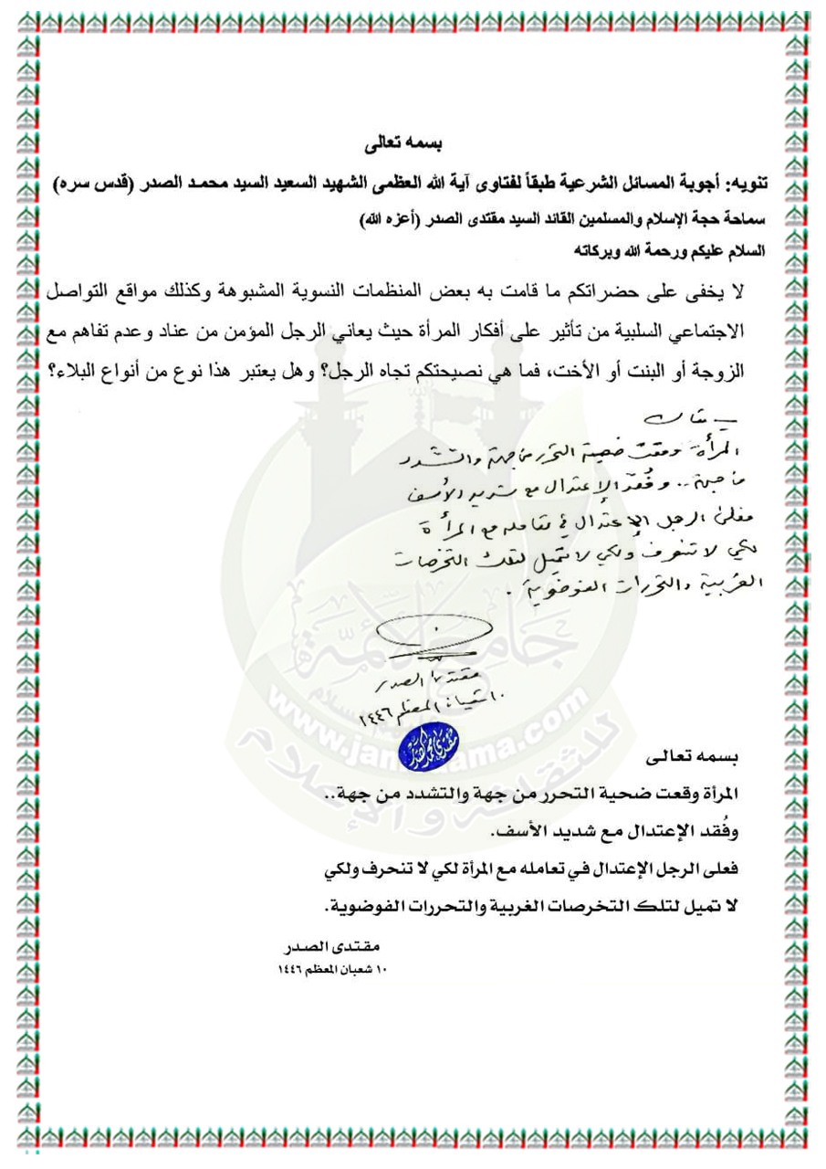 الأسئلة المُجابة من قِبل سماحة السيد مقتدى الصدر (أعزه الله).. اليوم الثلاثاء ١٨ / ٣ / ٢٠٢٥