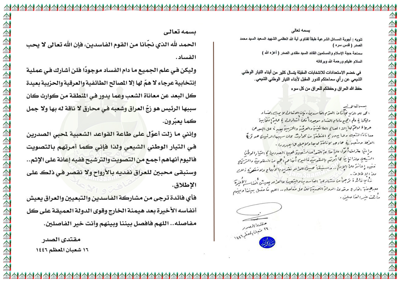 سماحة القائد السيد مقتدى الصدر (أعزه الله) يعلن مقاطعته للإنتخابات القادمة .. 27 / 3 / 2025