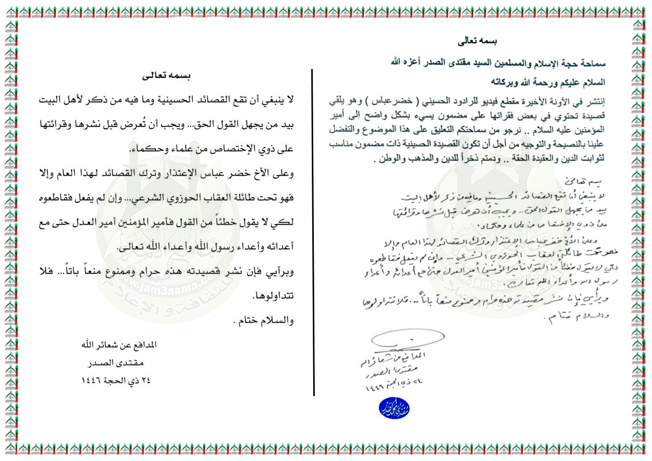 جواب سماحة السيد مقتدى الصدر (أعزه الله) على إستفتاء قُدّم له حول قصيدة للرادود (خضر عباس) 21 / 6 / 2025