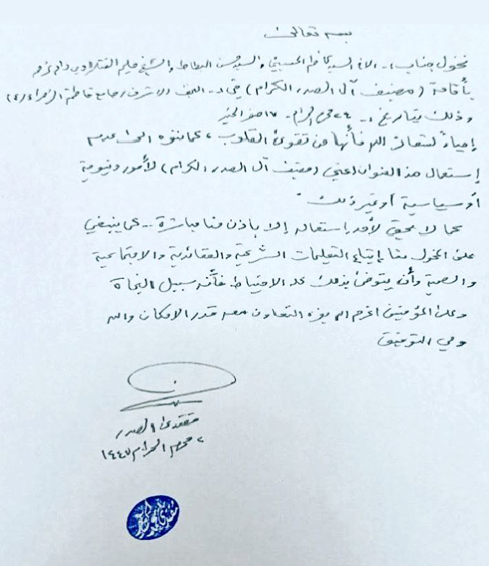 سماحة السيد مقتدى الصدر (أعزه الله) يصدر تخويلاً لعدد من الإخوة بإقامة مضيف آل الصدر الكرام في النجف الأشرف / جامع فاطمة الزهراء (عليها السلام) ٢١ / ٧ / ٢٠٢٥