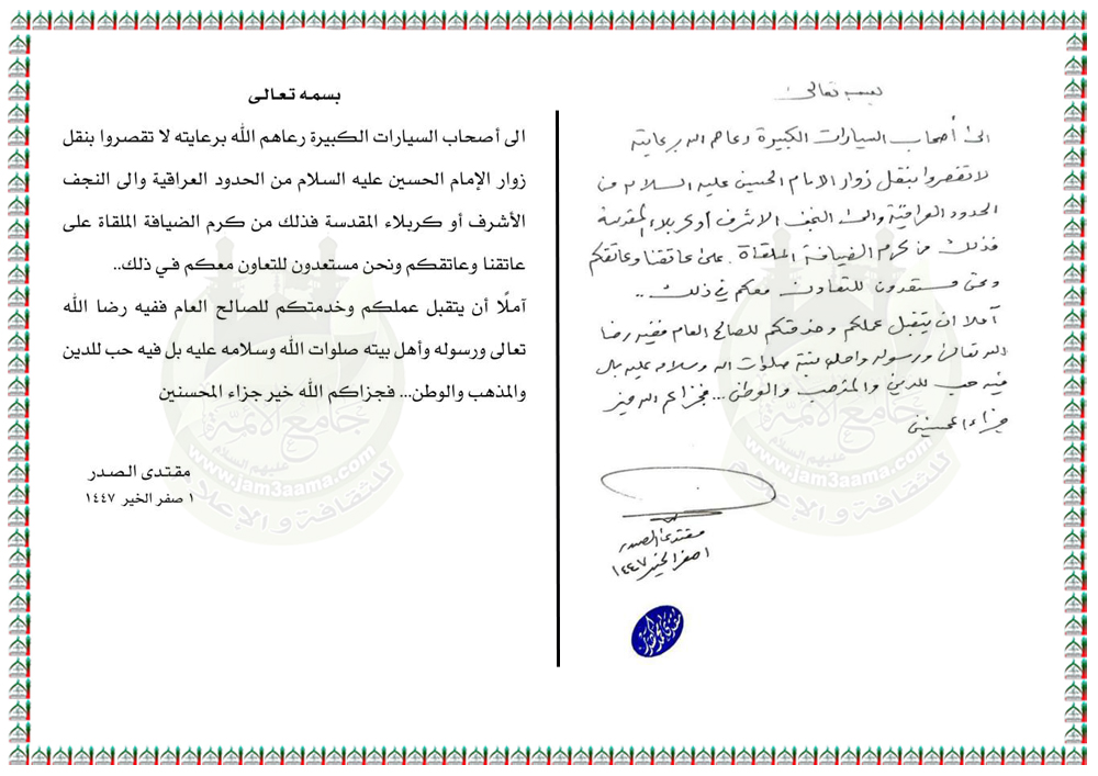 سماحة القائد السيد مقتدىٰ الصدر (أعزه الله) يدعو أصحاب السيارات الكبيرة أن لا يقصروا بنقل زوار الإمام الحسين عليه السلام الى النجف الأشرف أو كربلاء المقدسة 27 / 7 / 2025