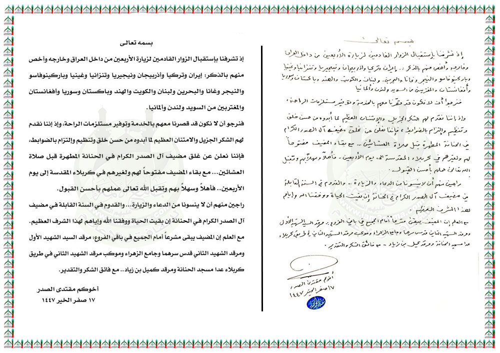 سماحة القائد السيد مقتدى الصدر (أعزه الله) يعلن عن غلق مضيف آل الصدر الكرام في الحنانة مع بقائه مفتوحاً في الفروع الأخرى 12 / 8 / 2025