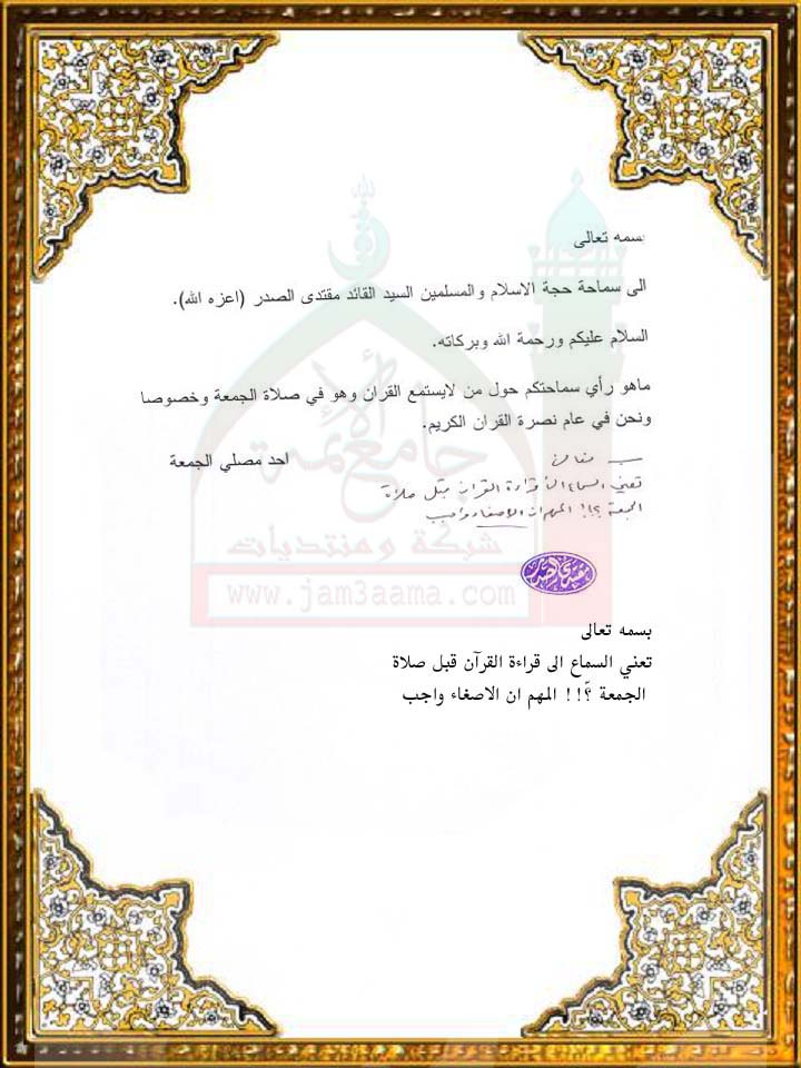 الانصات الى القران(استفتاء للسيد القائد بتاريخ 13-6-2011)