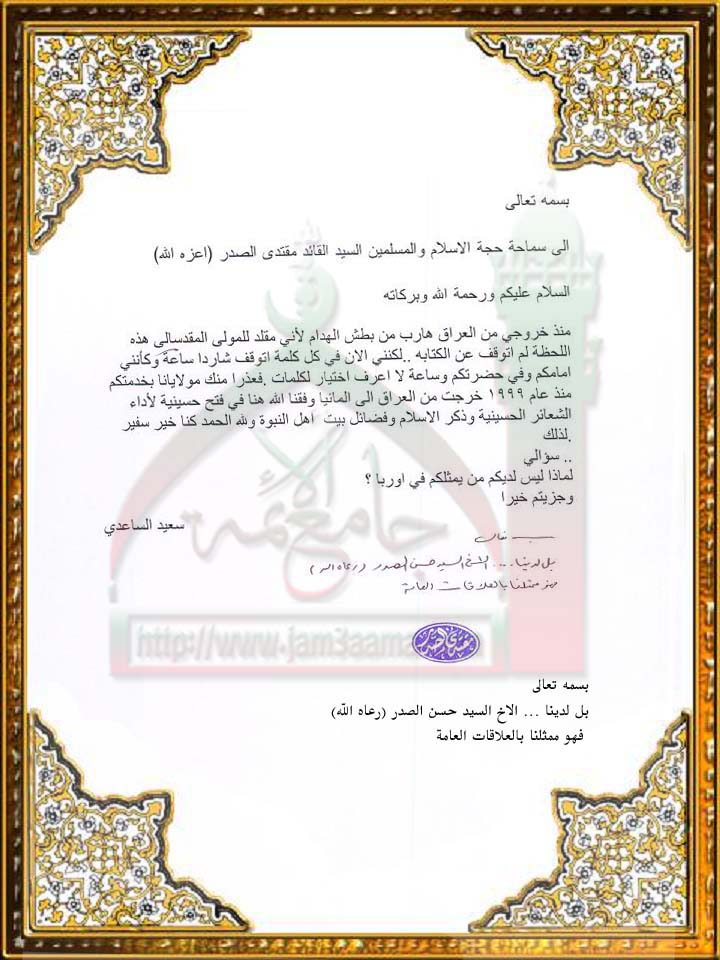 السيد حسن الصدر ممثلنا بالعلاقات العامة (استفتاء للسيد القائد بتاريخ 15/6/2011)