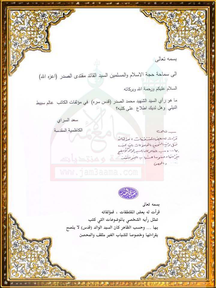 السيد الشهيد كان لاينصح بقراءة مؤلفات سبيط النيلي (استفتاء للسيد القائد بتاريخ 15-6-2011)