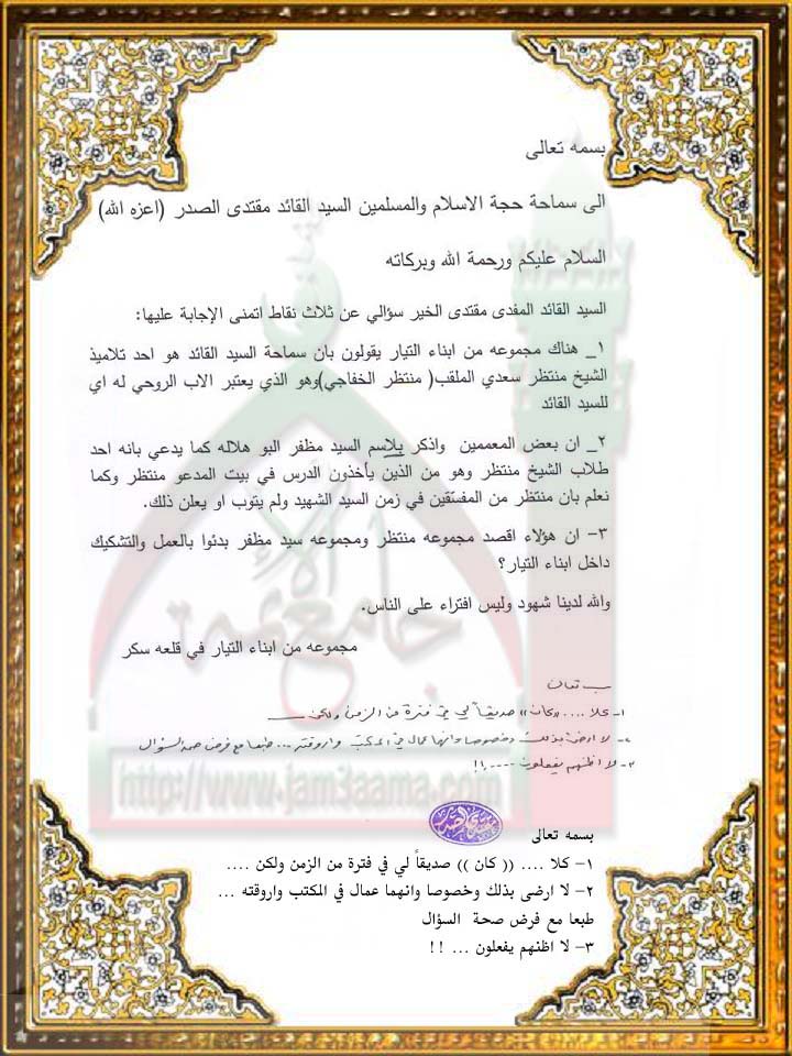 الشيخ منتظر الخفاجي (استفتاء للسيد مقتدى الصدر بتاريخ 15-6-2011)