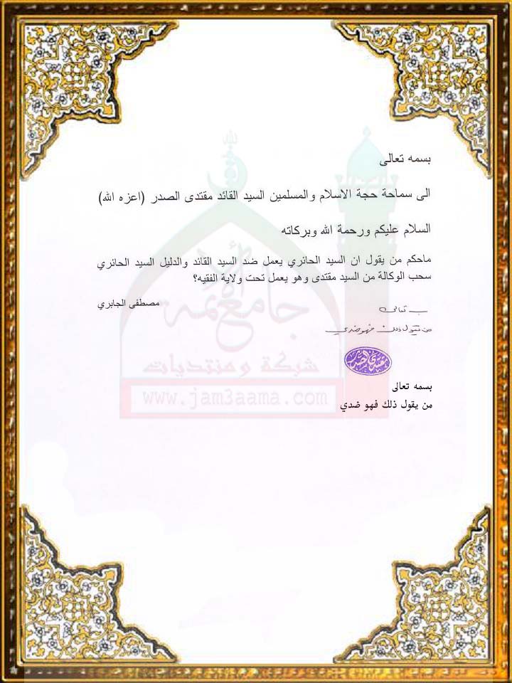 من يقول ان السيد الحائري يعمل ضدي فهو ضدي(استفتاء للسيد القائد بتاريخ 16-6-2011)