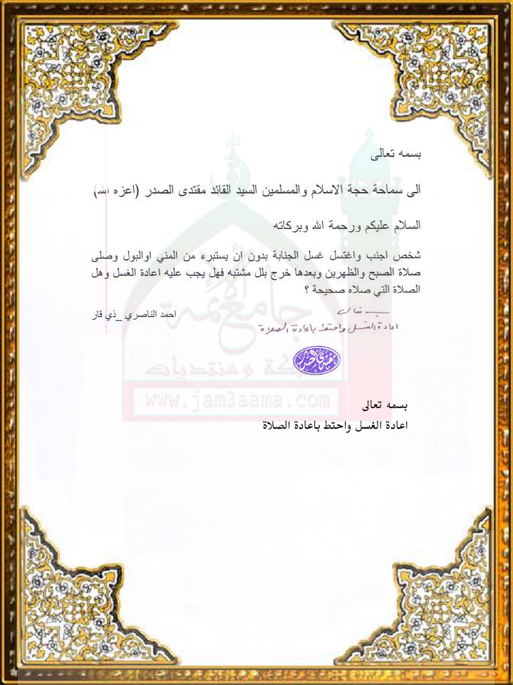 حكم الغسل لمن لم يستبرىء من المني او البول(استفتاء للسيد القائد بتاريخ 19-6-2011)