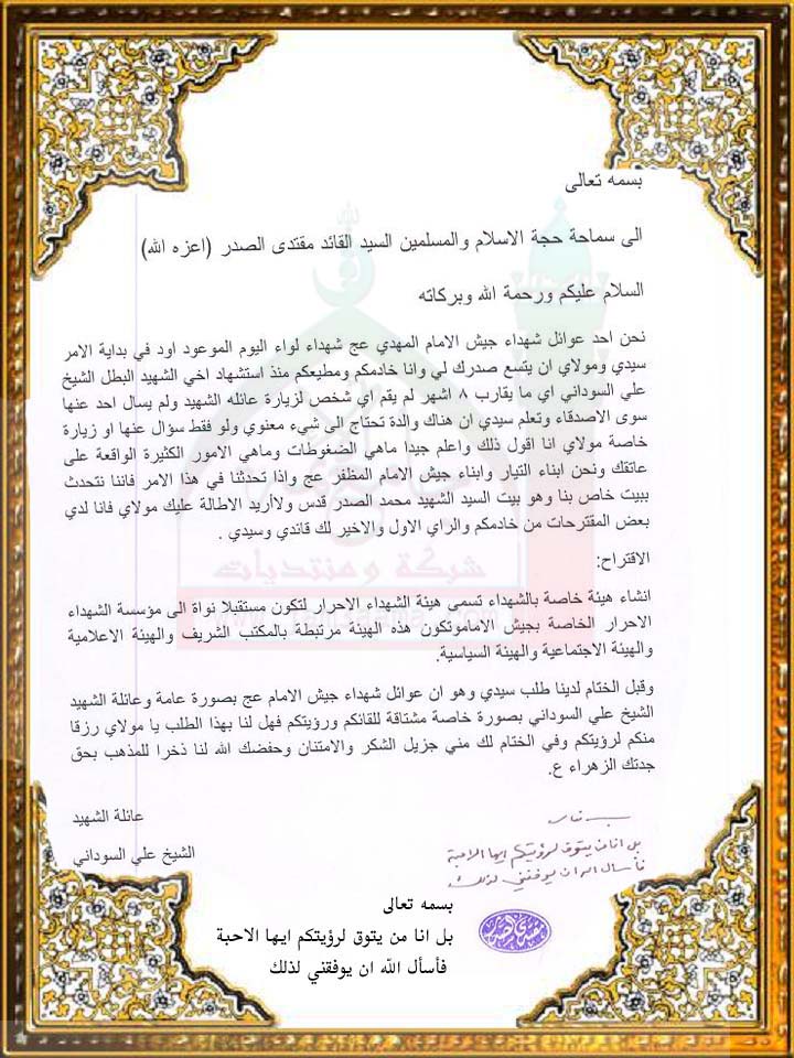 شوق عائلة احد شهداء جيش المهدي لرؤية سماحته (استفتاء للسيد القائد بتاريخ 19-6-2011)