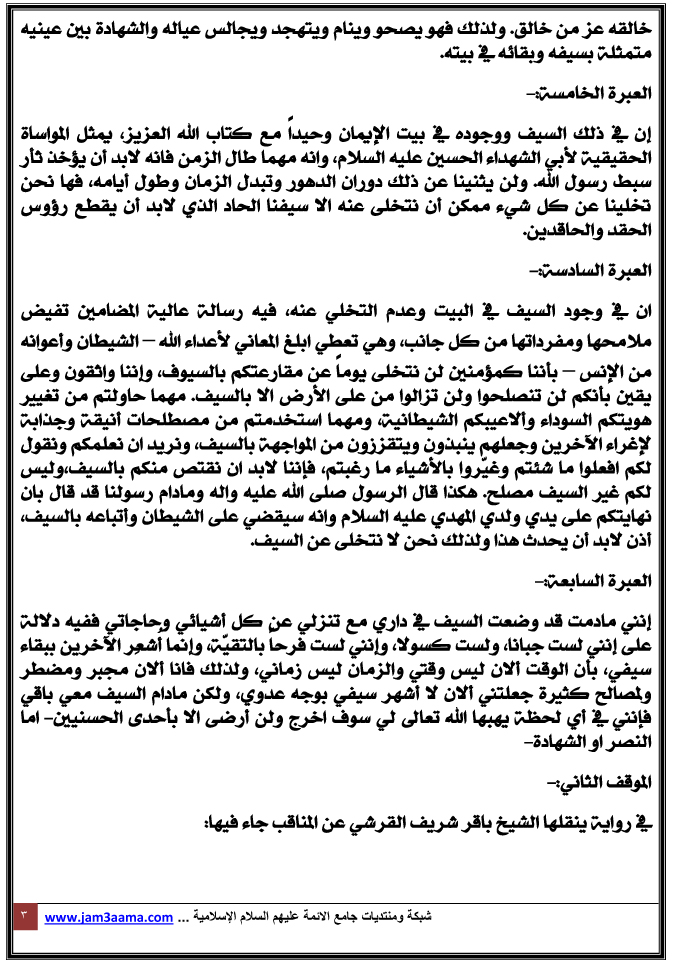 http://jam3aama.com/images/pictures/1309000082.jpg بسم الله الرحمن الرحيم اللهم صل على محمد وال محمد وعجل فرجهم والعن عدوهم أي شيء ياسيدي فيك أَكتُب ! فشهادة العصمة لن تحاط ... ومن قال إنّي أُحيط فهو يكذب لكن ماذا أفعل سبقتني مقلَتيَّ... بدموع للكاظم تندب فسالت على أوراقي وخطّت... كأنها تهتف : ياصريعاً في السجون يا إماما ياحنون ليتني أُذَرُّ بالشهادة... وتحت أقدامك أكون .... * إن في سيرة المعصومين عليهم السلام العبر تلو العبر، وكلما التفتنا الى قول من أقوالهم او فعل من أفعالهم تتفتح في أفق الإنسانية من ذلك القول او الفعل منافذ وأبواب للتربية الإسلامية بمنهجها المحمدي الصحيح الذي ما بخل عن عالم الإمكان بفيضه الطاهر ليسعى به الى منظوره الأكمل وليدخل عالم الاخره من مكانها الأعلى، حتى يسعد السعادة المثلى، حيث لا نصب ولا لغوب . ومن المواقف التي نستوحي منها العبر نختار موقفين من سيرة إمامنا موسى بن جعفر عليهما السلام هما : الموقف الاول:- في رواية ينقلها عن البحار الشيخ باقر شريف القرشي في كتابه حياة موسى بن جعفر : وقد حدثنا عن مدى زهده إبراهيم بن عبد الحميد فقال ( دخلت عليه في بيته الذي كان يصلي فيه، فإذا ليس في البيت شيء سوى خصفة، وسيف معلق، ومصحف) 1 ومن العبر التي يمكن أخذها من هذه الرواية مايلي: العبرة الاولى:- ان في وجود السيف ضمن الأشياء الموجودة – القران والخصفة – مع تخلي الإمام سلام الله عليه عن جميع الأشياء الأخرى، ليدل دلالة واضحة بانه مهما وصل الإنسان في حالة الزهد وترك الدنيا ونبذ ما فيها ، فليس عليه ان يتخلى عن سيفه، لان فيه الكرامة والعزة والحياة،وفي ذلك رعب لأعداء الله ورسوله مادام السيف بأيدينا. مهما حاول الآخرون من تشويه هذا المعنى الذي لطالما نوهّ عنه رسول الله صلى الله عليه واله في أحاديثه وهو يحث فيها على الجهاد والتضحية بالغالي والنفيس من اجل إرساء مبادئ الإسلام الأصيلة. العبرة الثانية:- إن في وضع الإمام عليه السلام للسيف أمام عينيه وإبقائه مع كتاب الله تعالى، لهو إشارة للمسلمين جميعا بان يضعوا الجهاد في سبيل الله نصب أعينهم وليتذكر المسلم كل حين أمر القتل والقتال في سبيل إعلاء كلمة لا اله إلا الله وان محمداً رسول الله ، وان المسلم كما يتعهد كتاب الله في كل يوم بل في كل حين عليه كذلك أن يتعهد سيفه في كل حين ليبقى جاهزاً مهيئاً لتلبية نداء القتال مع جهة الحق في أي زمان ومكان. العبرة الثالثة:- إن في ذلك الإبقاء للسيف نبذ للدنيا وملذاتها، إذ من غير المعقول أن يكون الفرد متوجهاً الى الدنيا مقبلاً عليها بكل ما يملك من قدرة ويكون في نفس الوقت محباً للموت في أي لحظة، لان صاحب الدنيا لا يتمنى الموت ولا للحظة واحدة، قال تعالى: {وَلَن يَتَمَنَّوْهُ أَبَداً بِمَا قَدَّمَتْ أَيْدِيهِمْ}2. وعلى العكس من ذلك فان الذي وضع السيف في داره مع تخليه عن جميع الأشياء الأخرى، لهو خير دليل بان صاحبه لن تهمه الدنيا بقدر جناح ذبابة،لان السيف قد مثل عنوانه الأخروي ورغبته في لقاء الله تعالى في أي وقت يدعوه أهل الله إليه. العبرة الرابعة:- ورد عن رسول الله صلى الله عليه واله ( من مات ولم يغز ولم يحدث نفسه بغزو مات على شعبة من النفاق) وفي حديث آخر ( من سأل الشهادة بصدق، بلغه الله منازل الشهداء، وان مات على فراشه) . وفي هذين الحديثين يريد رسول الله صلى الله عليه واله أن يرغبنا بعدم الخروج من هذه الدنيا بموت عادي، وإنما على المسلم والمؤمن الحقيقي أن يكون سفره الى الآخرة عن طريق الشهادة ويكون جواز سفره الى الله دماءه التي يقدمها رخيصة بين يدي خالقه عز من خالق. ولذلك فهو يصحو وينام ويتهجد ويجالس عياله والشهادة بين عينيه متمثلة بسيفه وبقائه في بيته. العبرة الخامسة:- إن في ذلك السيف ووجوده في بيت الإيمان وحيداً مع كتاب الله العزيز، يمثل المواساة الحقيقية لأبي الشهداء الحسين عليه السلام، وانه مهما طال الزمن فانه لابد أن يؤخذ ثأر سبط رسول الله. ولن يثنينا عن ذلك دوران الدهور وتبدل الزمان وطول أيامه، فها نحن تخلينا عن كل شيء مم