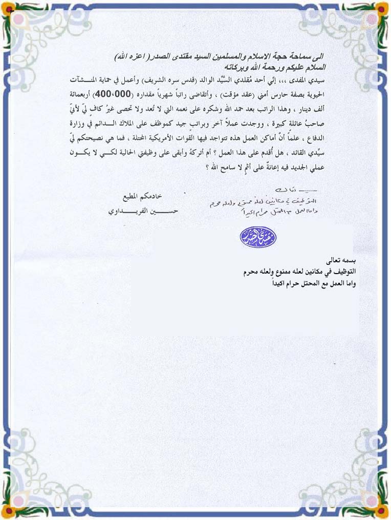 استفتاء للسيد القائد حول بعض الوظائف الحكومية ومع تواجد المحتل فيها بتاريخ 5-12-2010