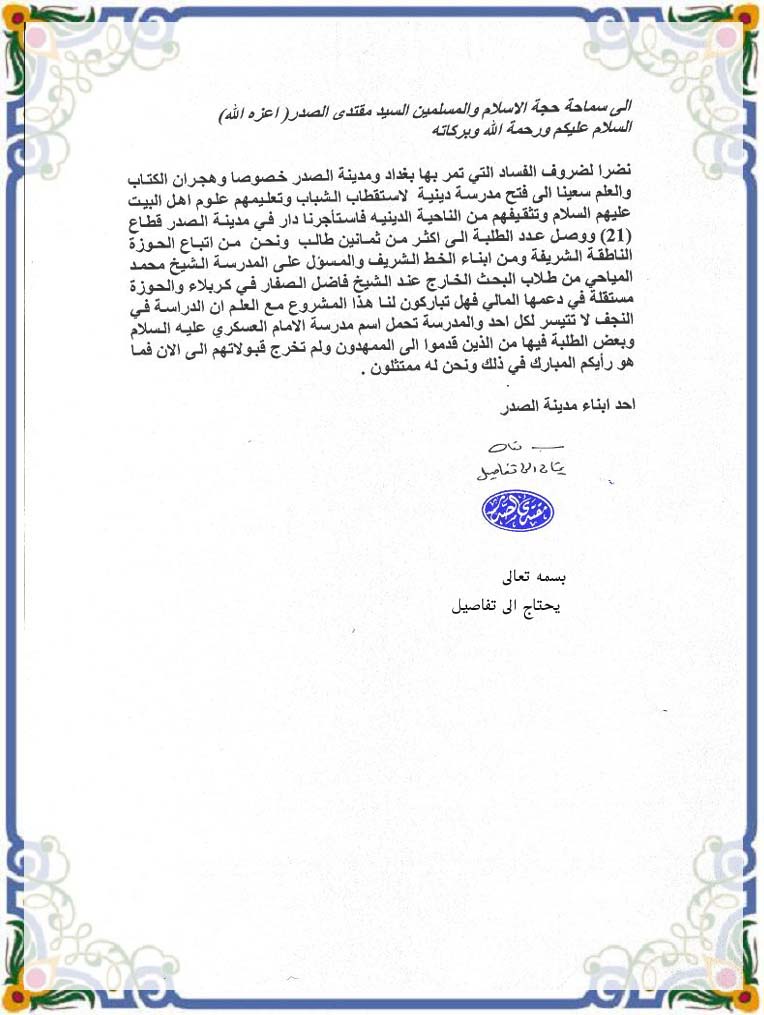 استفتاء للسيد القائد مقتدى الصدر حول فتح مدرسة دينية بتاريخ 5-12-2010