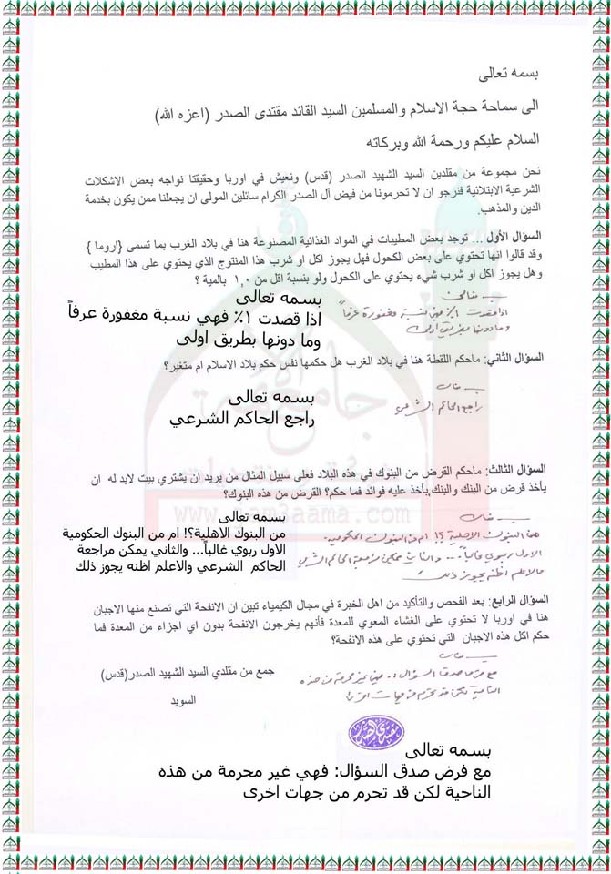 مسائل ابتلائية في بلاد الغربة والمهجر(استفتاء للسيد القائد بتاريخ12-7-2011)