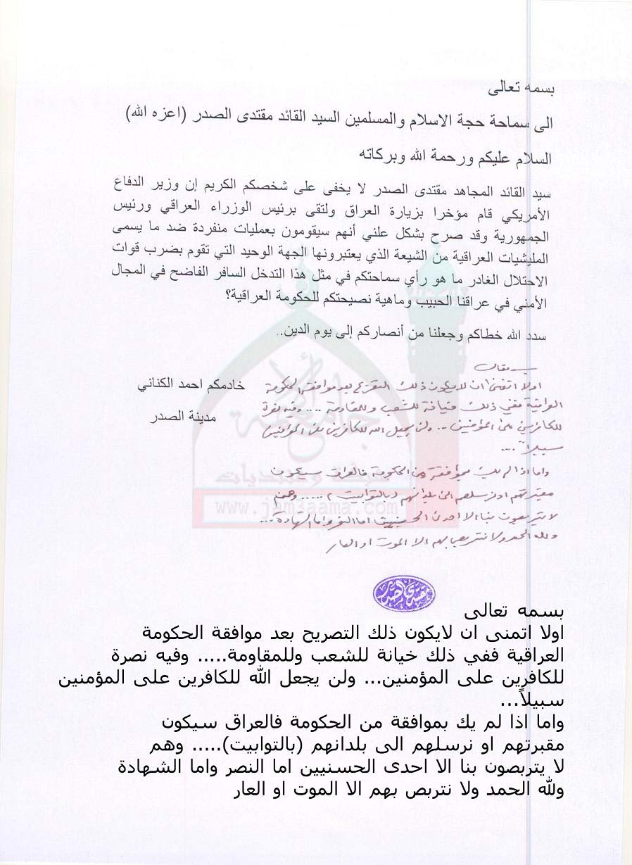 العراق سيكون مقبرتهم او نرسلهم الى بلدانهم بالتوابيت(استفتاء للسيد القائد بتاريخ13-7-2011)