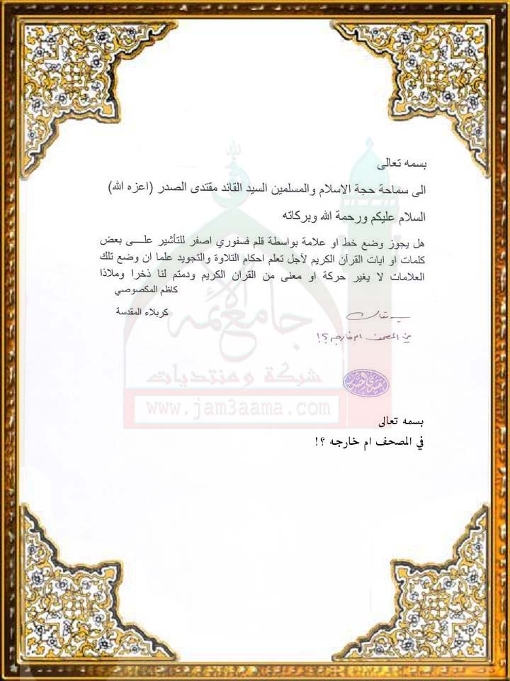 مسالة حول المصحف(استفتاء للسيد القائد بتاريخ13-7-2011)