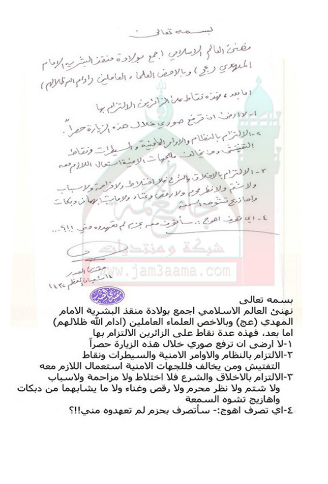 وصايا مهمة لزائري الزيارة الشعبانية الالتزام بها(بيان للسيد القائد بتاريخ16-7-2011)