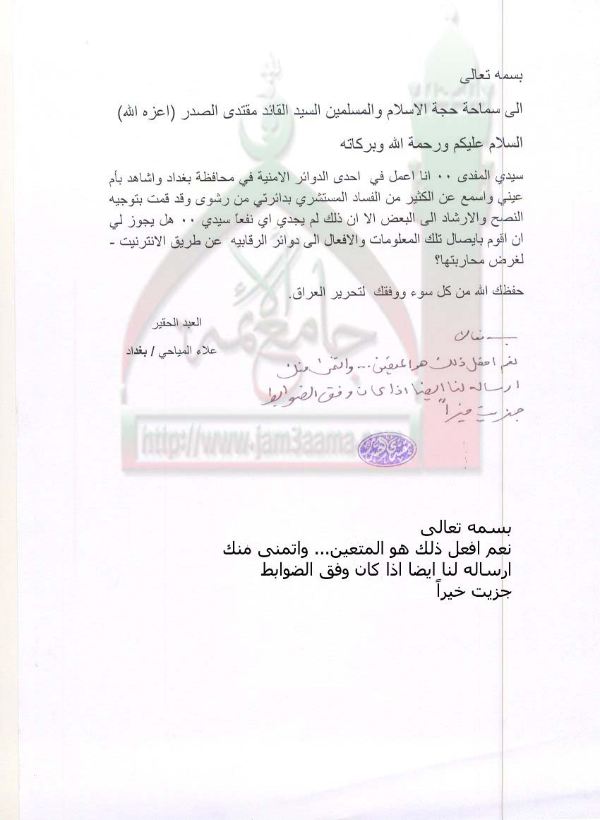 الفساد الاداري المستشري في احد الدوائر الامنية استفتاء للسيد القائد بتاريخ17-7-2011