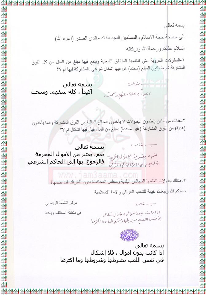 حرمة الاموال الماخوذة كاشتراك في بطولات كرة القدم(استفتاء للسيد القائد بتاريخ17-7-2011)
