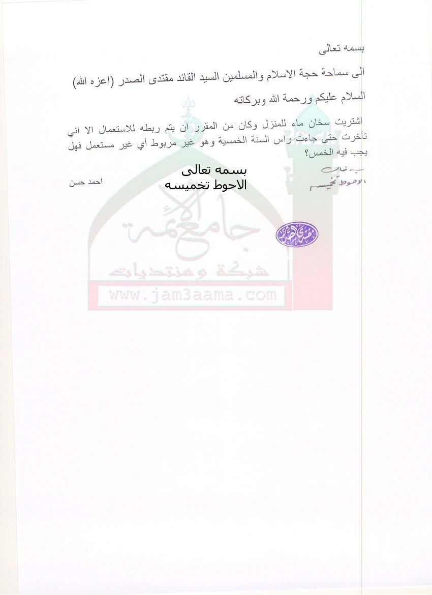 الاحوط تخميس السلعة الغير مستعملة اثناء السنة الخمسية(استفتاء للسيد القائد بتاريخ19-7-2011)