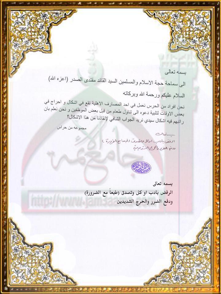 الاكل من طعام الذين يشتغلون في المصارف الاهلية(استفتاء للسيد القائد بتاريخ20-7-2011)