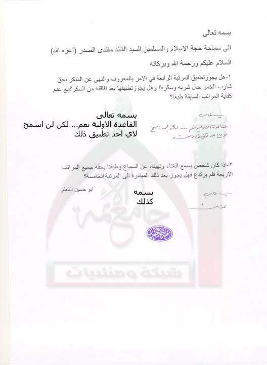لا اسمح لاي احد بتطبيق المرتبة الرابعة في الامر بالمعروف والنهي عن المنكر(استفتاء للسيد القائد بتاريخ21-7-2011)