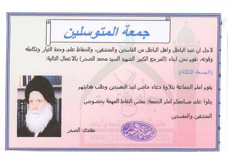جمعة المتوسلين - على ائمة الجمع تلاوة دعاء خاص لنبذ المفسدين وعرض بعض النقاط المهمة يخصوص المنشقين والمندسين في الجمعة القادمة(استفتاء للسيد القائد بتاريخ22-7-2011)