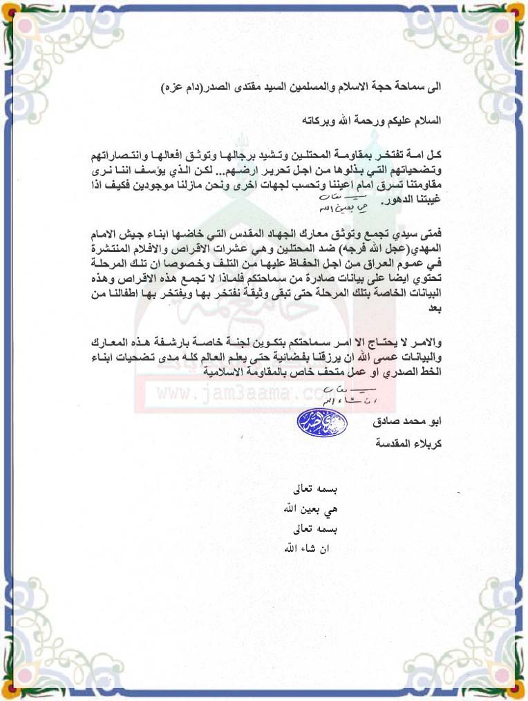 استفتاء للسيد القائد حول توثيق معارك جيش المهدي بتاريخ 8-12-2010