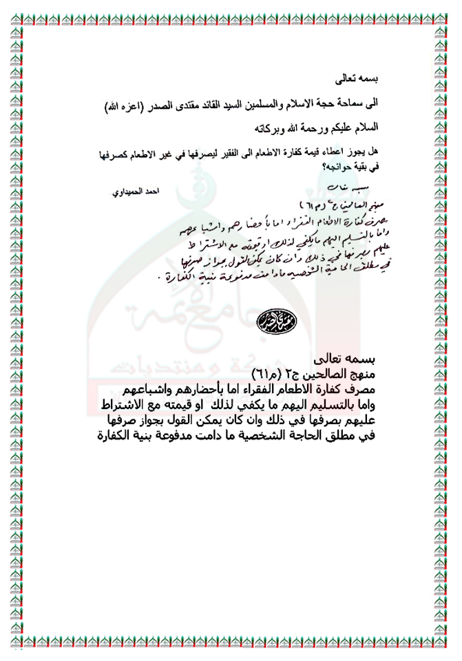 كفارة الاطعام والتصرف فيها استفتاء للسيد القائد بتاريخ24-7-2011)