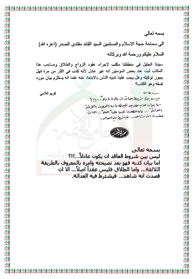 ليس من شروط مجري الايقاعات والعقود ان يكون عادلا(استفتاء للسيد القائد بتاريخ24-7-2011)