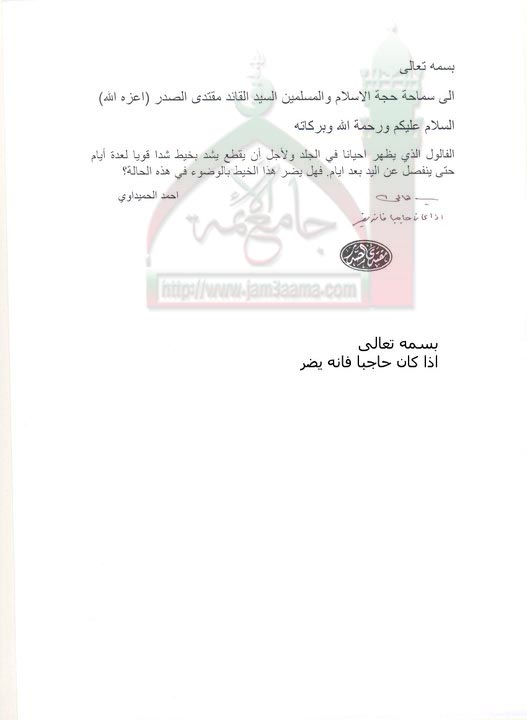 الخيط المستعمل لاستئصال الفالول اذا كان حاجبا فانه يضر بالوضوء(استفتاء للسيد القائد بتاريخ24-7-2011)