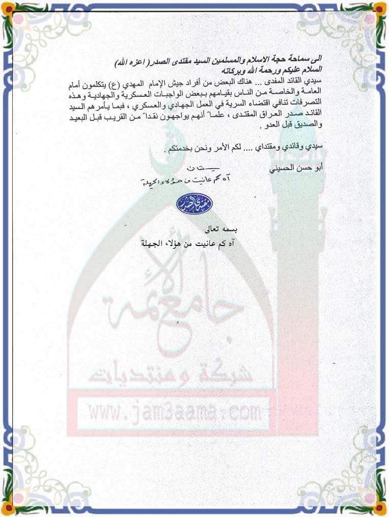 استفتاء للسيد القائد حول بعض من افراد جيش المهدي بتاريخ 8-12-2010