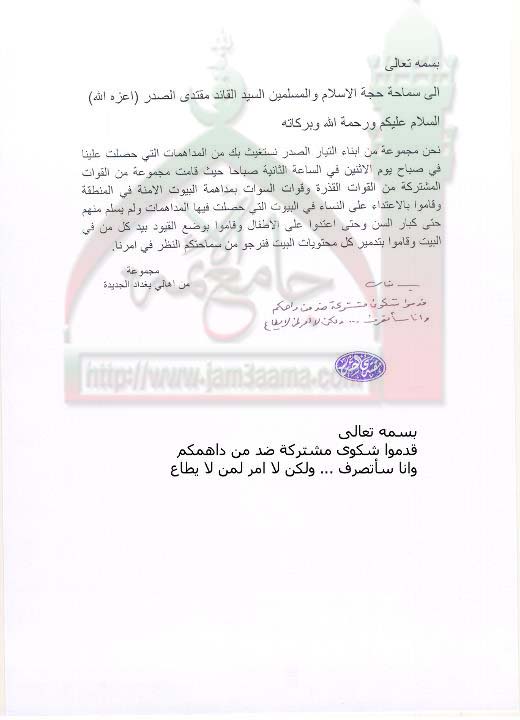 المداهمات الليلية للابرياء من سكنة بغداد الجديدة(استفتاء للسيد القائد بتاريخ26-7-2011)