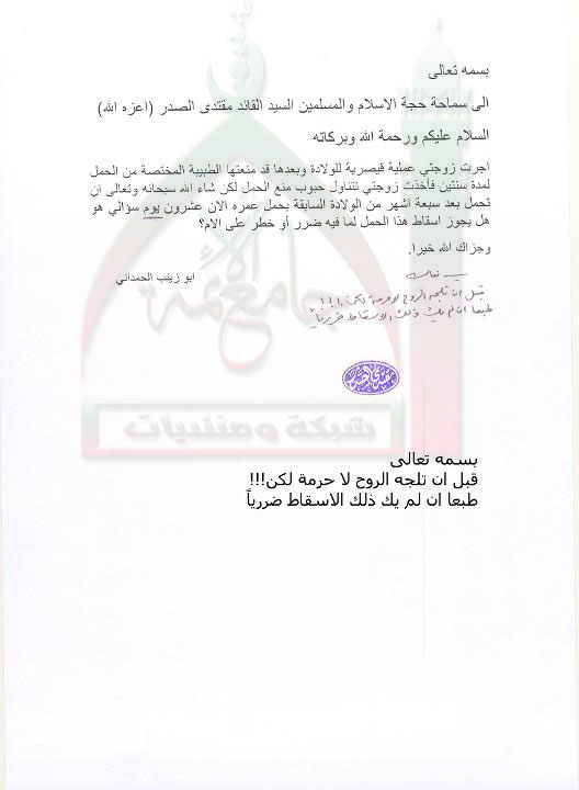 اسقاط الحمل الاضطراري(استفتاء للسيد القائد بتاريخ26-7-2011)