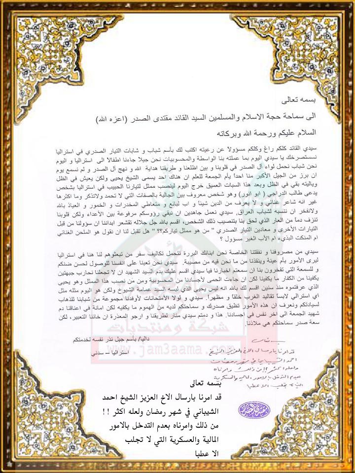 تشكيل ممثلية لمكتب السيد الشهيد الصدر(قد) في استراليا(استفتاء للسيد القائد بتاريخ27-7-2011)