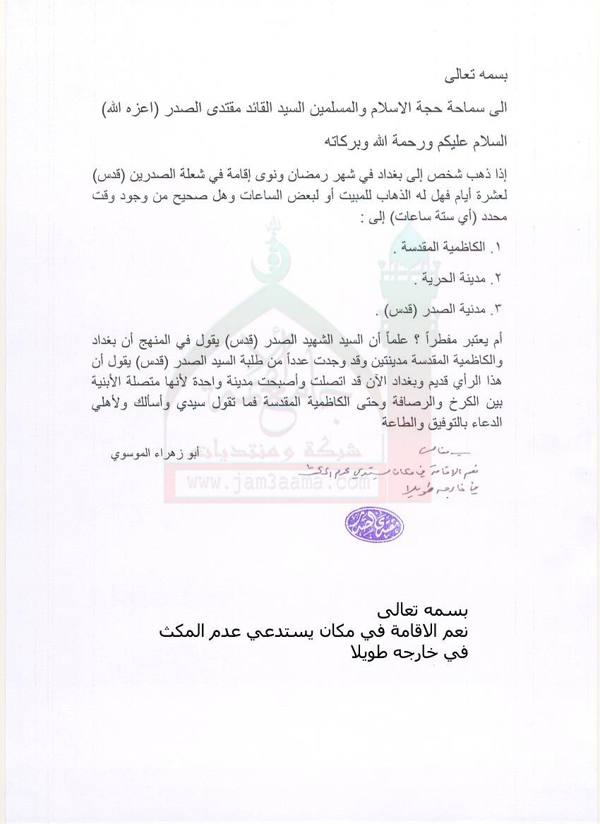 الاقامة في مكان (عند السفر)يستدعي عدم المكث في خارجه طويلا (استفتاء للسيد القائد بتاريخ28-7-2011)