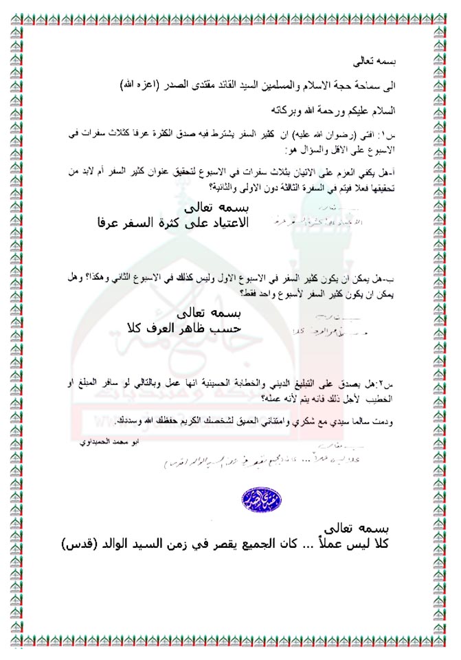 كثير السفر يصدق عرفا على من له ثلاث سفرات في الاسبوع على الاقل(استفتاء للسيد القائد بتاريخ30-7-2011)