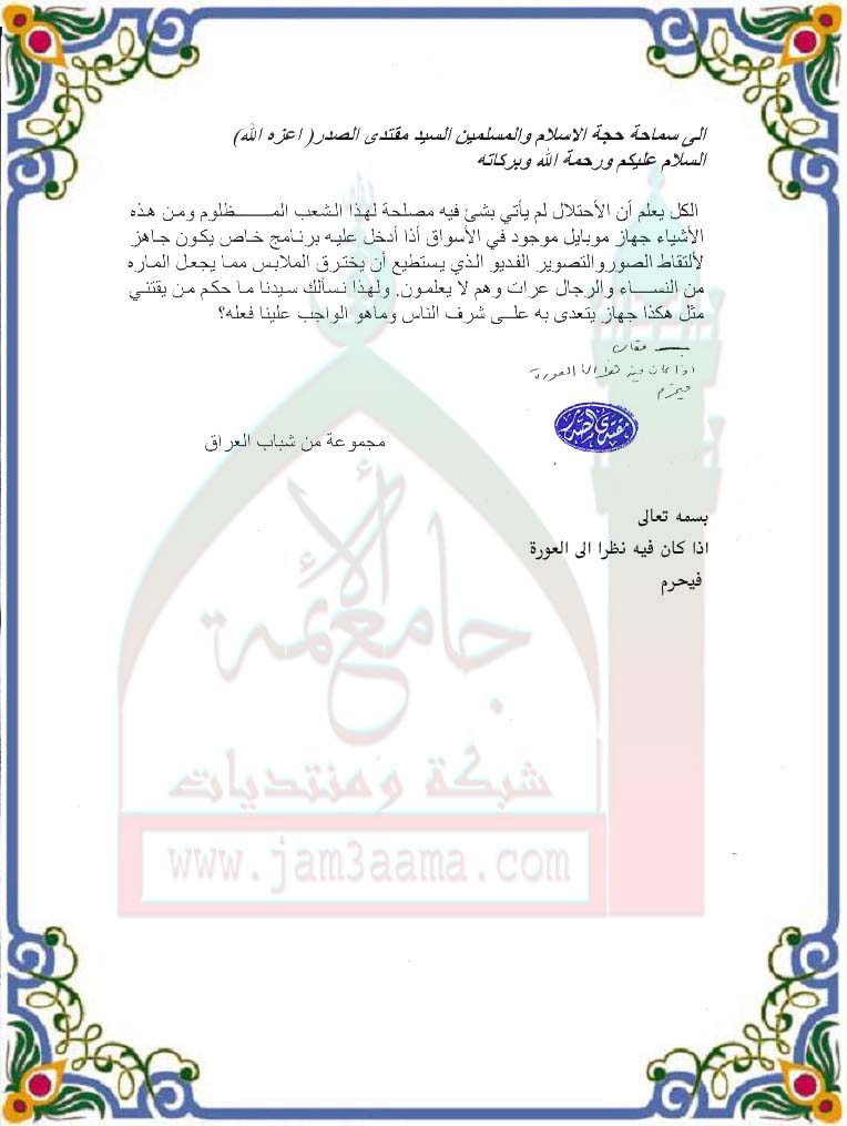 استفتاء للسيد القائد مقتدى الصدر حول الموبايل ذو البرامج الخاصة بتاريخ 10-12-2010
