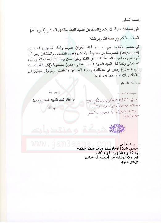 شكراً لأخلاصكم وهذه الوثيقة بين أيديكم (استفتاء السيد القائد مقتدى الصدر 2 آب 2011