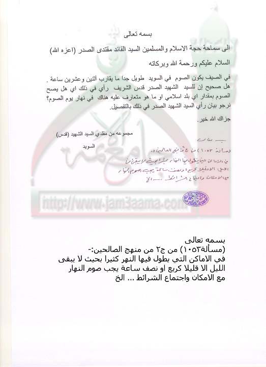 الصوم في الأماكن التي يطول فيها النهار (إستفتاء السيد القائد مقتدى الصدر ليوم 2 آب 2011 )